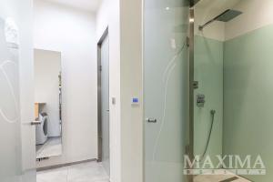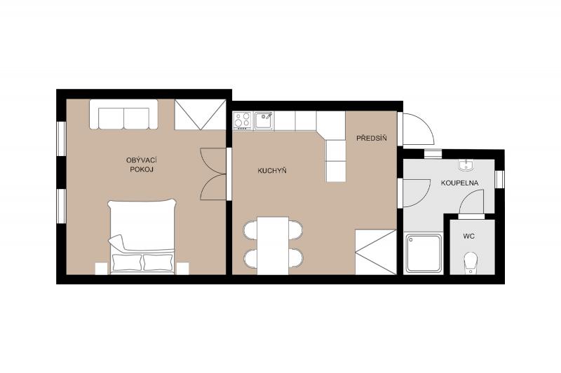 Interiér bytu je vybaven kvalitním nábytkem a prémiovými značkami s důrazem na detail, funkčnost a nadčasový design. Dispozice zahrnuje obytný prostor s ložnicí, plně vybavenou kuchyň s jídelním stolem, koupelnu se sprchovým koutem a podlahovým vytápěním, pračku se sušičkou a samostatnou toaletu. K bytu náleží také sklep o velikost 10m2, v domě je společná kolárna.
