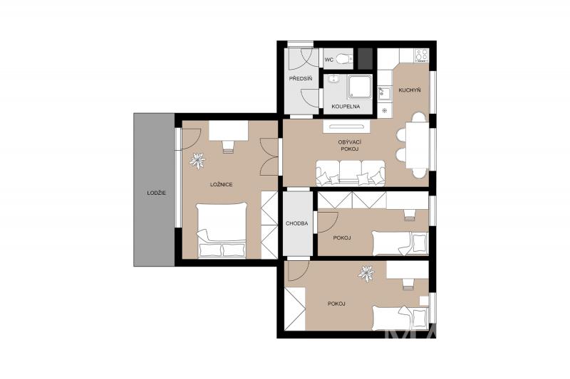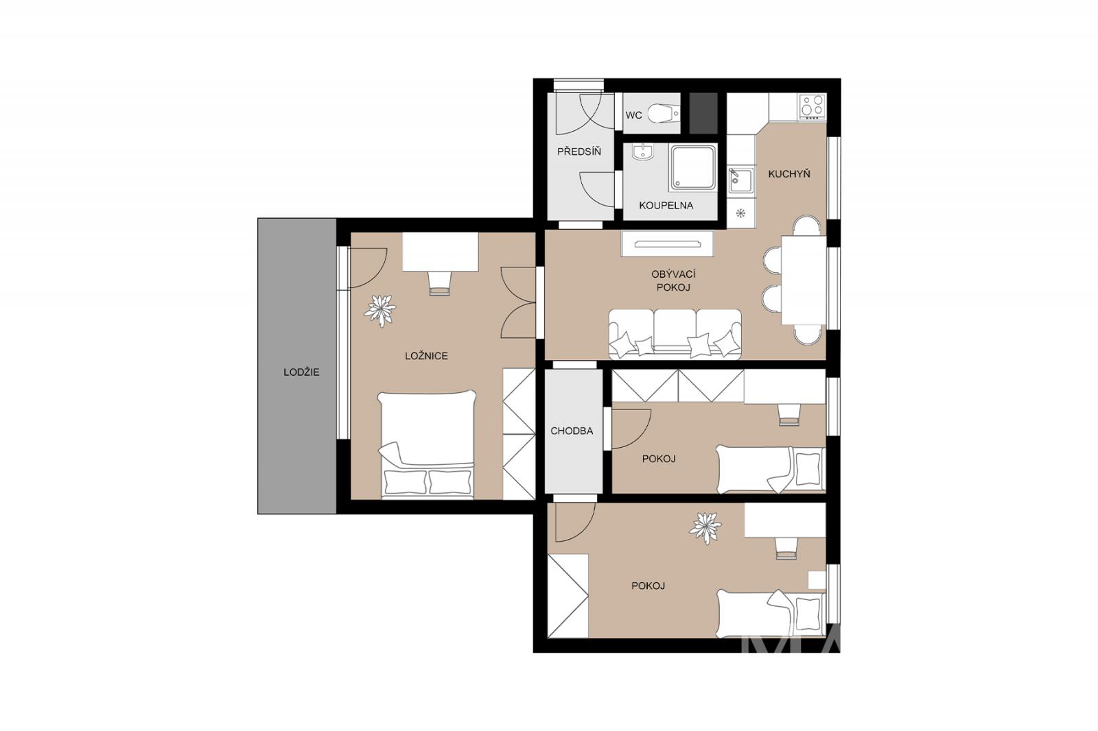 Dispozice bytu je 4+kk o ploše 74,6 m2 + lodžie o velikosti 7,5 m2. Byt se skládá z jídelní části (12,75 m2) s kuchyňským koutem (5,50 m2) orientovaným na severozápad, vybaveným kuchyňskou linkou se spotřebiči, obývacího pokoje (21,13 m2) průchozího s jídelnou, orientovaného na jihovýchod se vstupem na zasklenou lodžii, dvou samostatných ložnic (9,98 m2 a 13,02 m2 - severozápad), koupelny se sprchovým koutem a umyvadlem, samostatné toalety a předsíně. Součástí také vestavěná šatní skříň.
