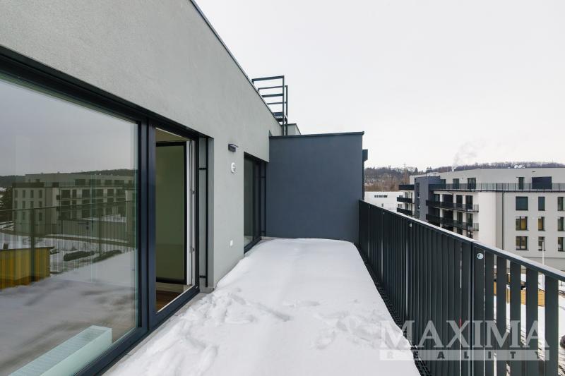 Dispozice a relaxace: Ze všech pokojů je vstup na nadstandardní terasu (15,6 m2) s výhledem do kraje _ ideální pro letní grilování nebo ranní kávu. Byt se nachází ve 4. patře s výtahem.