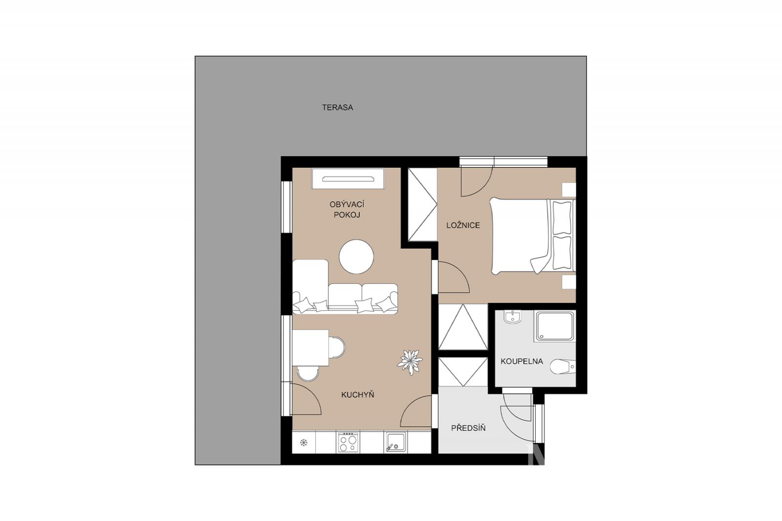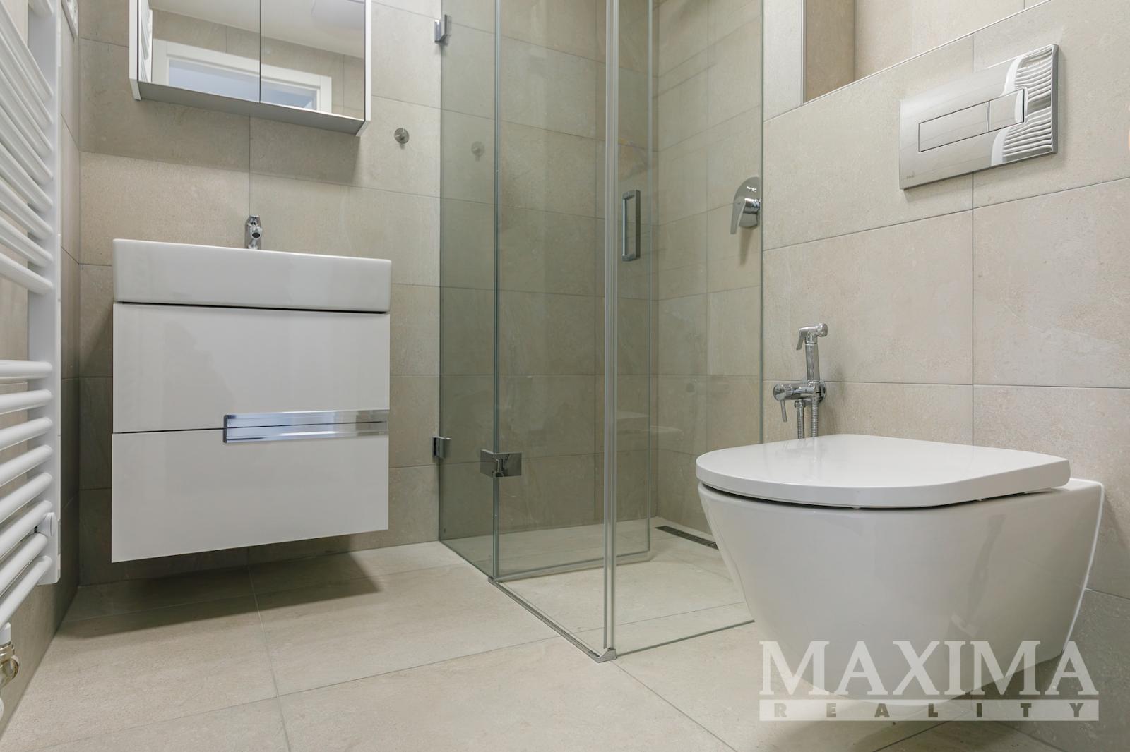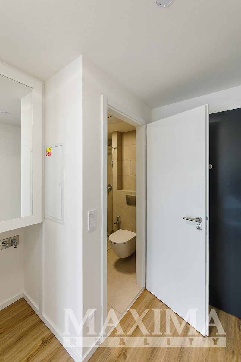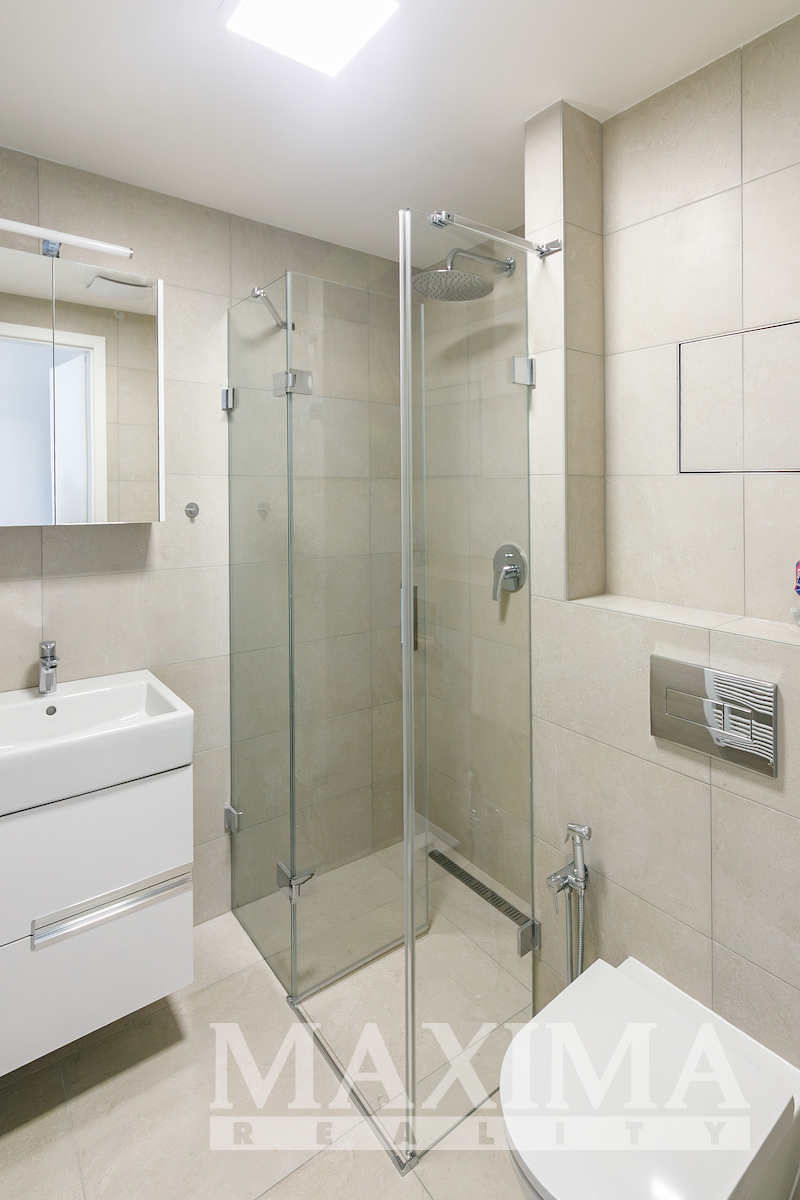 Byt nabídne 2 pokoje se spoustou světla díky velkým francouzským oknům, s výstupem na zmíněnou terasu z obou pokojů, koupelnu se sprchovým koutem a toaletou a předsíň. V kuchyni nainstalována nová kuchyňská linka v hezkém elegantním bílo černém vzhledu, vybavená spotřebiči. Před letními vedry i zimním chladem vás budou chránit venkovní žaluzie. Kromě kuchyně je byt nabízen k pronájmu nezařízený. V domě k dispozici výtah.