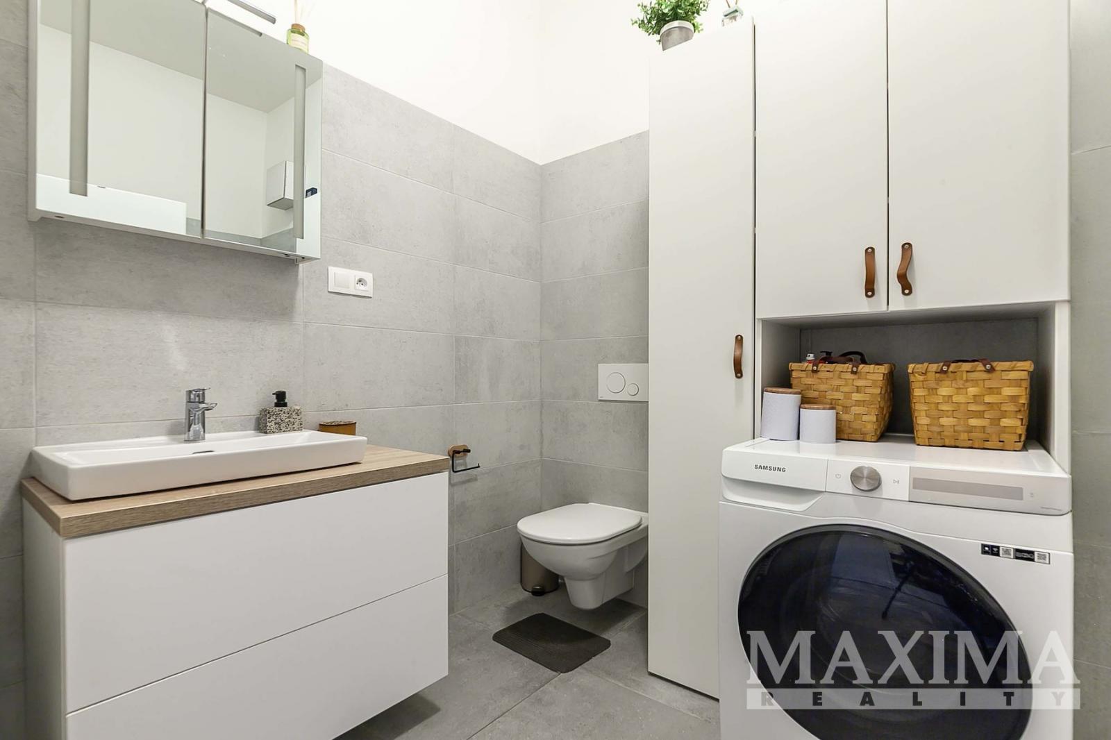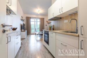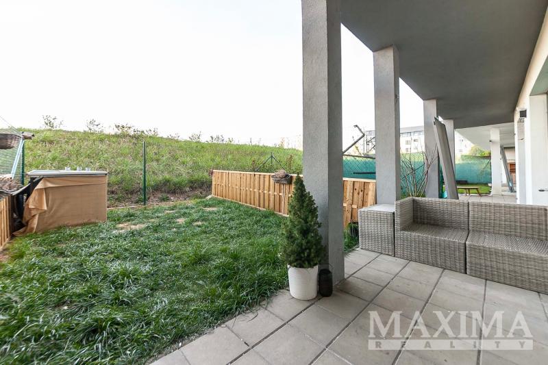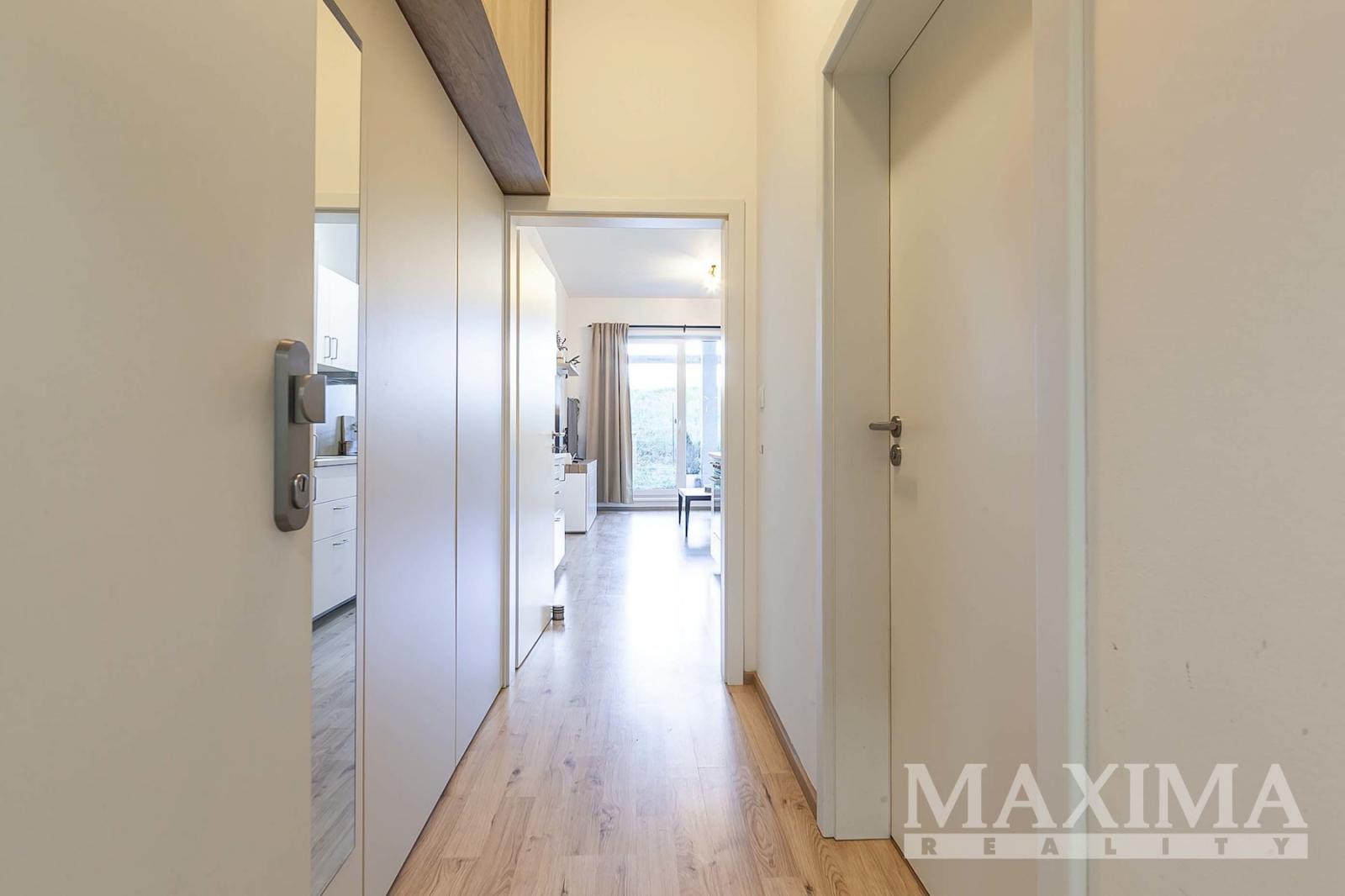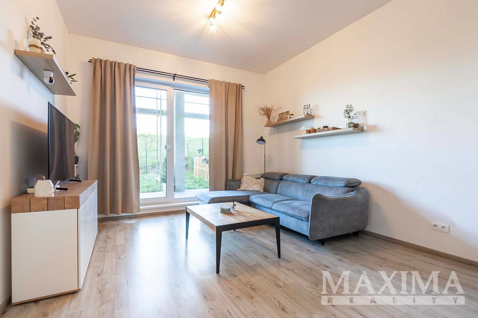 Interiér byl navržen s důrazem na maximální pohodlí a praktické využití prostoru. Dispozice bytu zahrnuje vstupní předsíň s vestavěnou skříní, koupelnu s vanou, WC a přípojkou na pračku. Hlavní obytný prostor tvoří vzdušný obývací pokoj s plně vybaveným kuchyňským koutem (indukční varná deska, elektrická trouba, lednice s mrazákem, myčka nádobí) a oddělenou částí určenou ke spaní. Z obývacího pokoje je přímý vstup na terasu a soukromou zahradu, která poskytuje ideální prostor pro relaxaci.