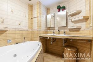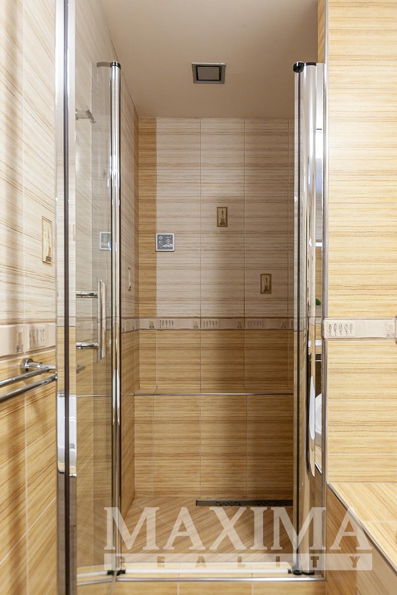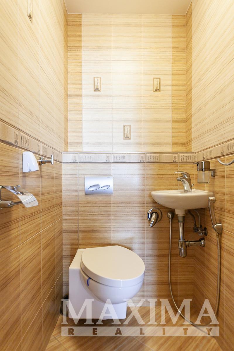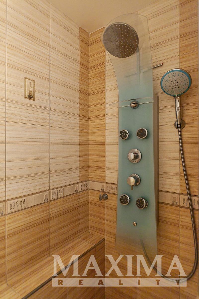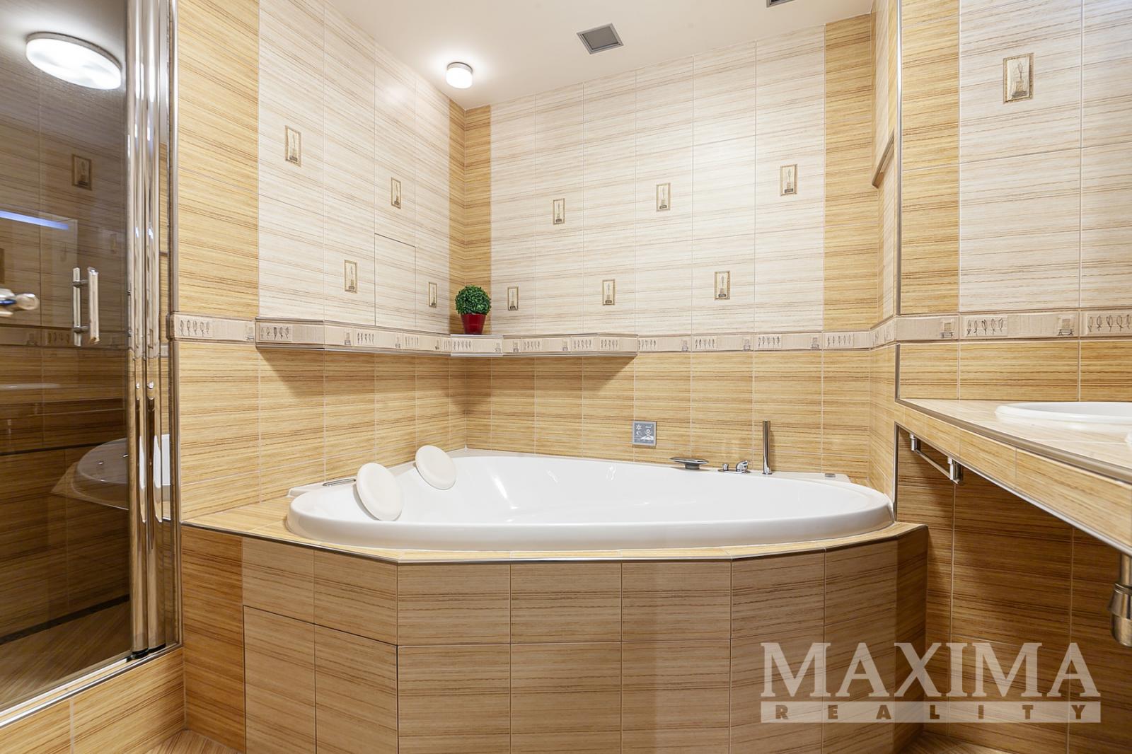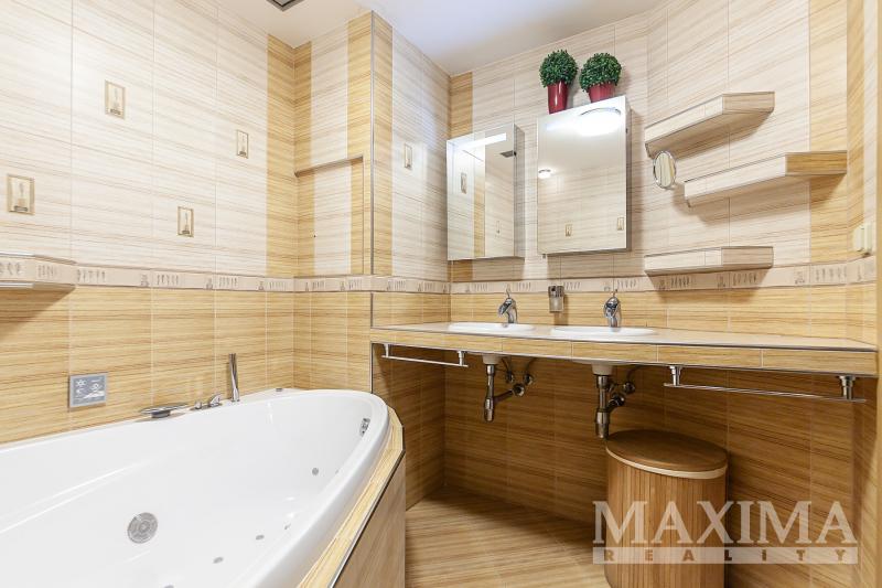 V koupelně je rohová masážní vana a masážní sprchový kout, dvě umyvadla a inteligentní ovládání rádia, odtahu světel. Dále je zde samostatná toaleta s umyvadlem.