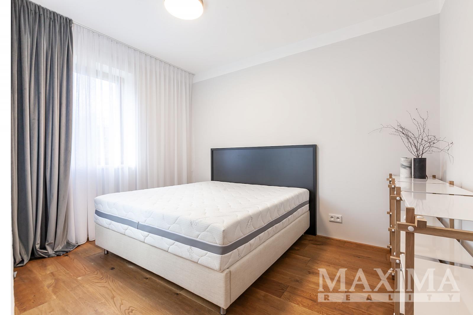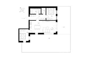 Obývací pokoj s kuchyňským koutem (31,4 m2), ložnice (11,3 m2), ložnice (10,6 m2), šatna (2,3 m2), koupelna s vanou a WC (6,1 m2), chodba (8,6 m2), terasa (34,3 m2), zahrada (75,7 m2).