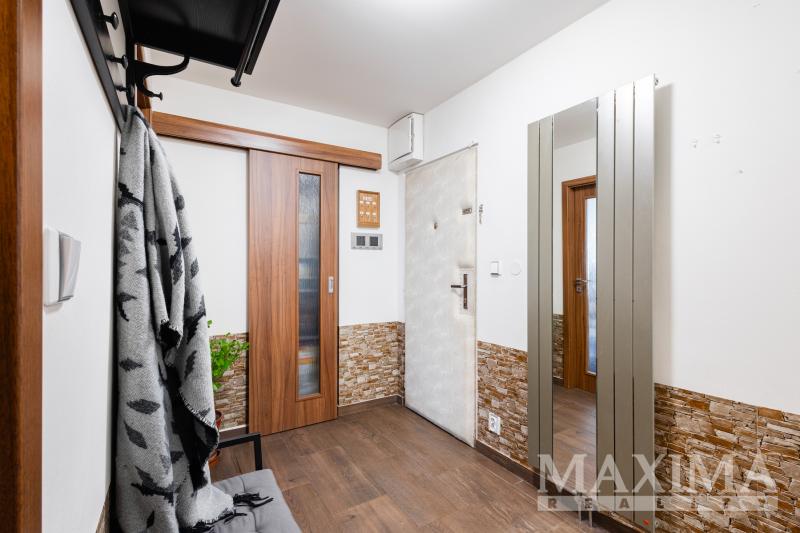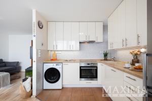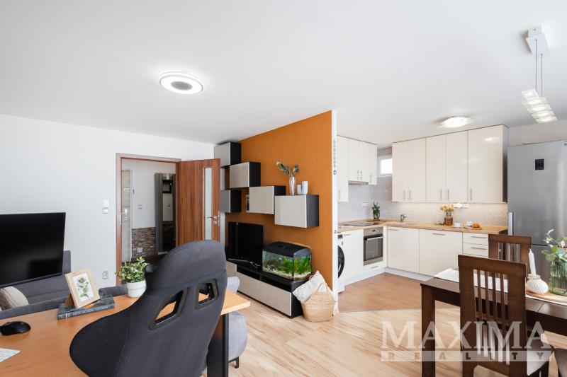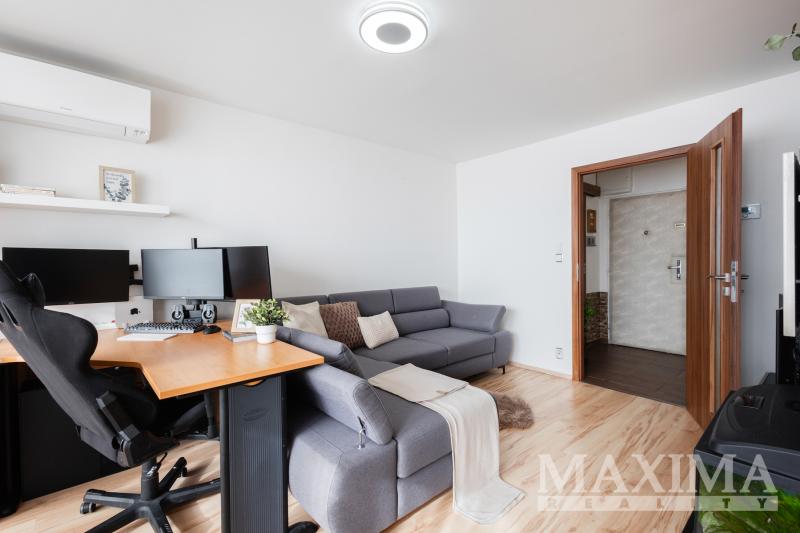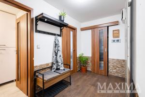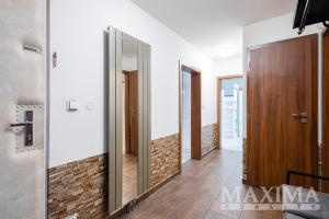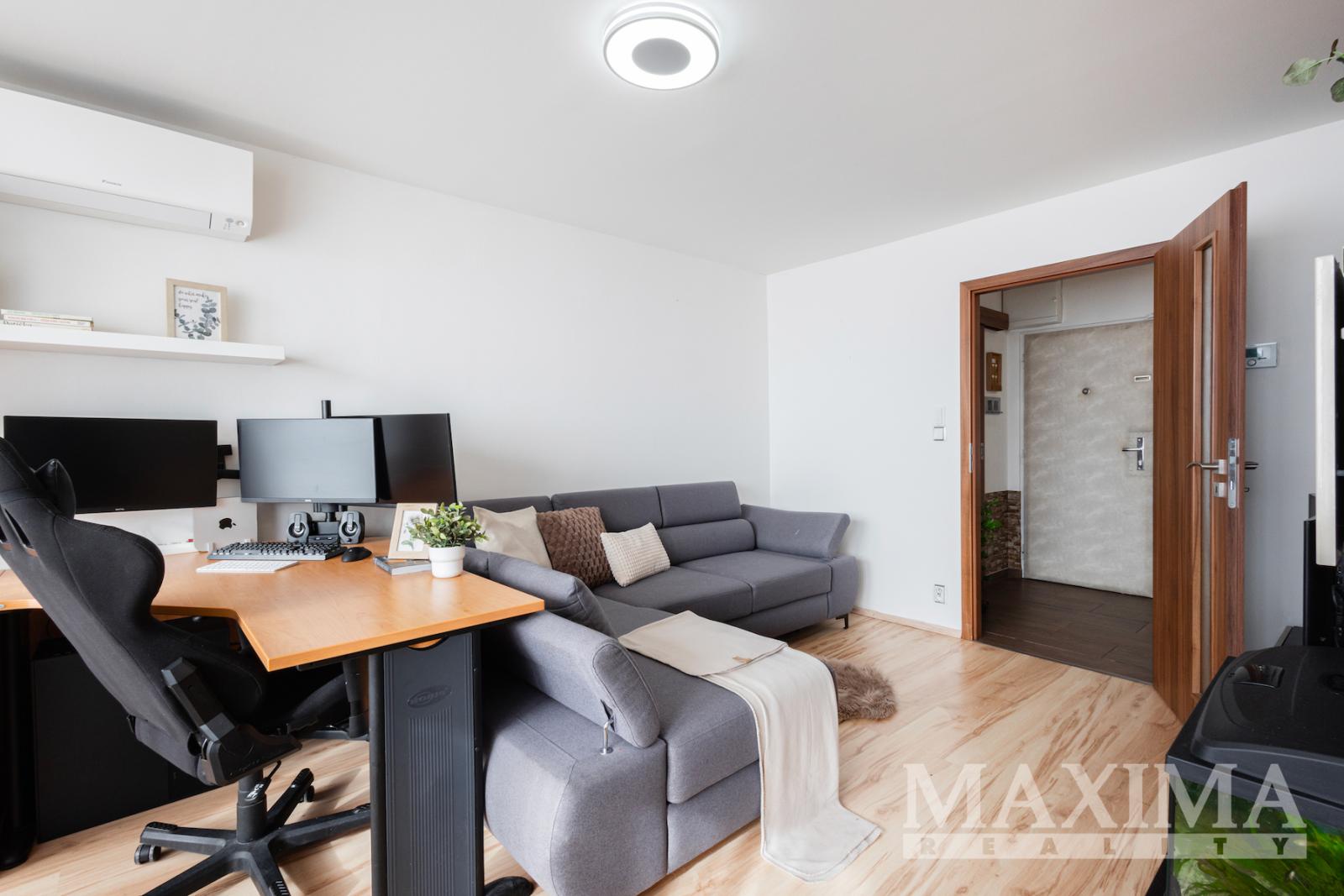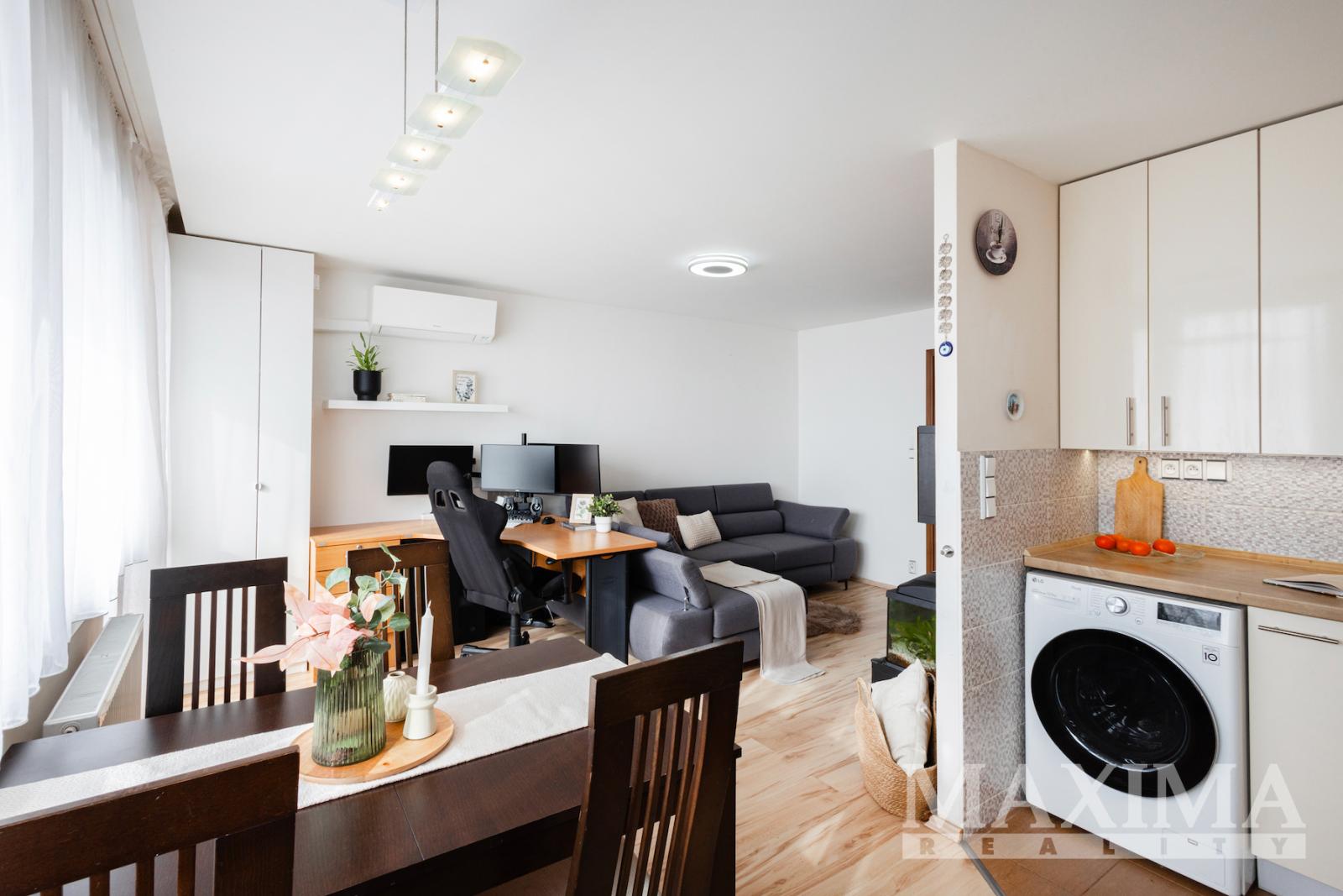 Obývací pokoj je navíc vybaven klimatizační jednotkou. Součástí bytu je také moderní kuchyňská linka a praktická, prostorná komora přímo v bytě.