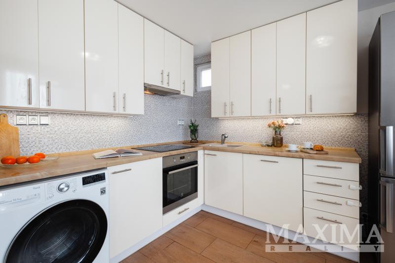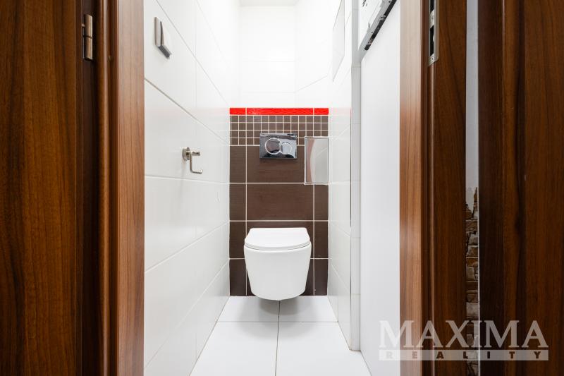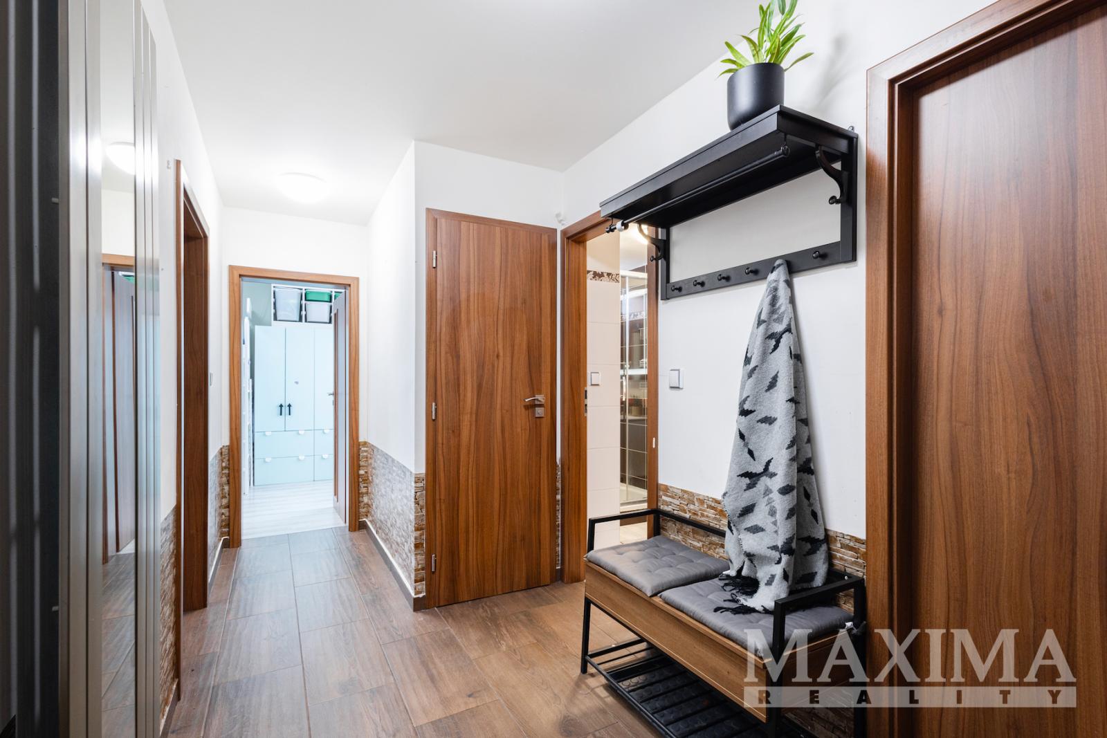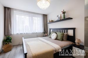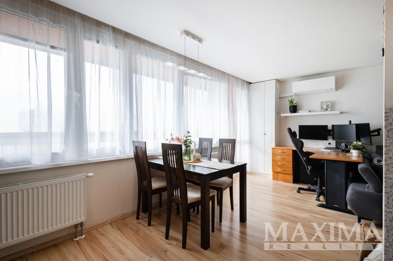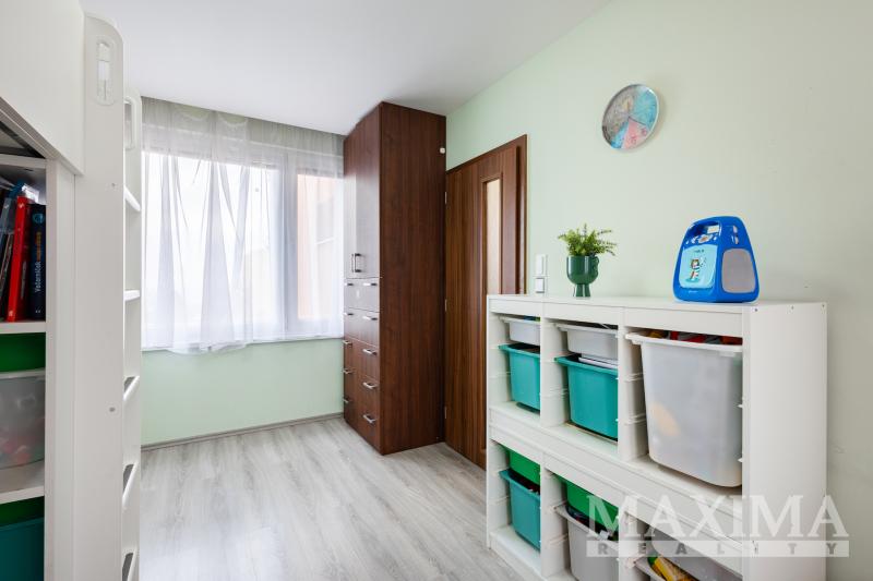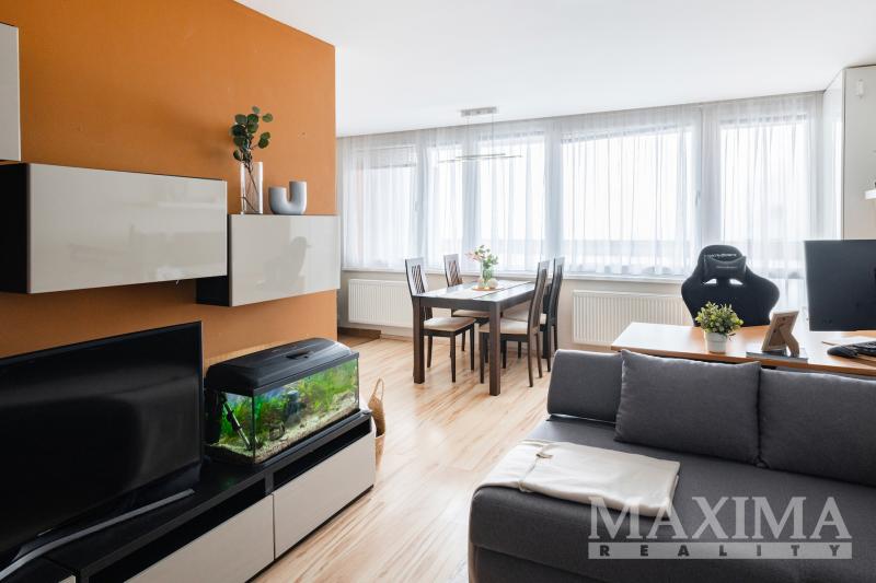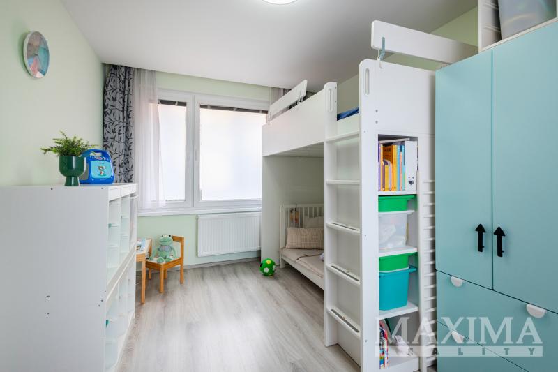 Obývací pokoj je navíc vybaven klimatizační jednotkou. Součástí bytu je také moderní kuchyňská linka a praktická, prostorná komora přímo v bytě.
