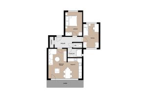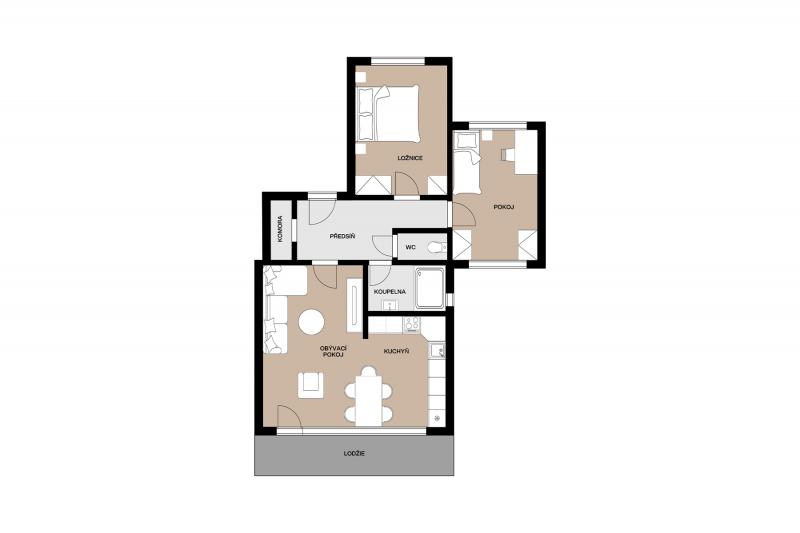 Dispozice je velmi příjemná a funkční. Obě neprůchozí ložnice jsou orientovány na sever, což zajišťuje klid a příjemné klima, zatímco obývací pokoj je situován na jih a navazuje na lodžii s krásným výhledem na celou Prahu.