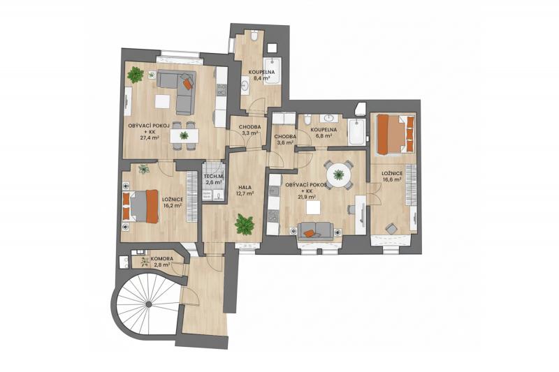 Variabilní dispozice bytu umožňuje jak využití jako prostorného 4+kk, tak i rozdělení na dvě samostatné jednotky 2+kk o velikosti 57,9 m2 a 48,7 m2 se společným vstupem. Tato kombinace výjimečné polohy, vysokého standardu bydlení a flexibilní dispozice z něj činí ideální volbu jak pro vlastní bydlení, spojení vlastního bydlení a podnikání (například jako reprezentativní kancelář v jednom z bytů), tak také jako investici k pronájmu v historickém centru metropole.