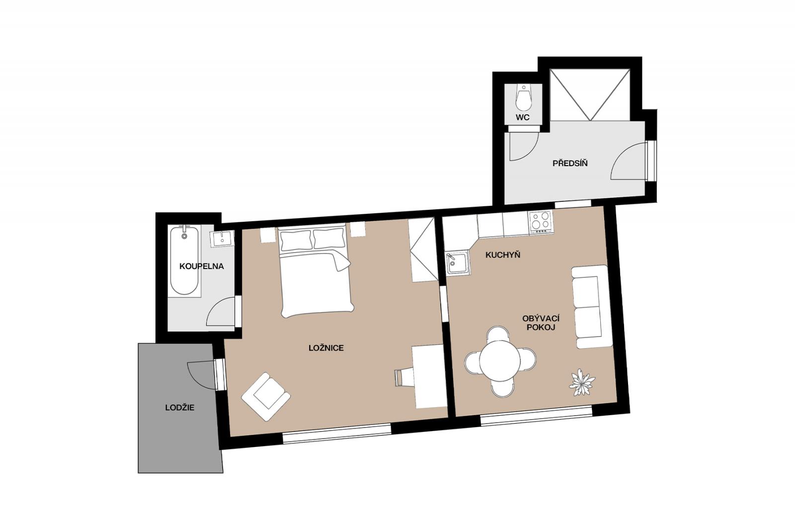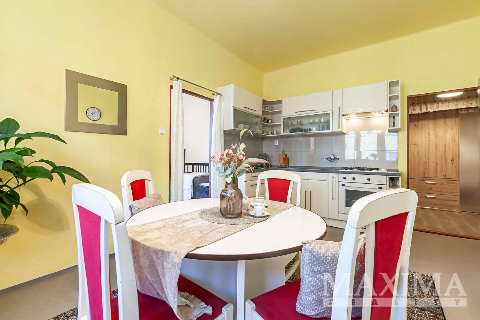 Dispozice bytu zahrnuje prostornou kuchyň o velikosti 18,1 m2, obývací pokoj o výměře 20,4 m2 s přímým vstupem na lodžii o velikosti 4,7 m2, koupelnu s vanou a prostorem pro pračku (4 m2), samostatné WC a předsíň. Byt má zděné jádro, plastová okna, rozvody elektřiny v mědi a bezpečnostní vstupní dveře. Vytápění je řešeno novými plynovými kamny WAW s výhřevnou deskou, ohřev vody zajišťuje bojler. K dispozici je sklep o velikosti 3,2 m2. V domě je zaveden optický kabel pro vysokorychlostní internet a parkování je možné v okolí domu. Měsíční zálohy do SVJ včetně fondu oprav činí 2.110 Kč, elektřina a plyn jsou hrazeny samostatně dle spotřeby.