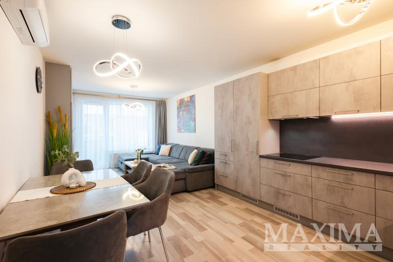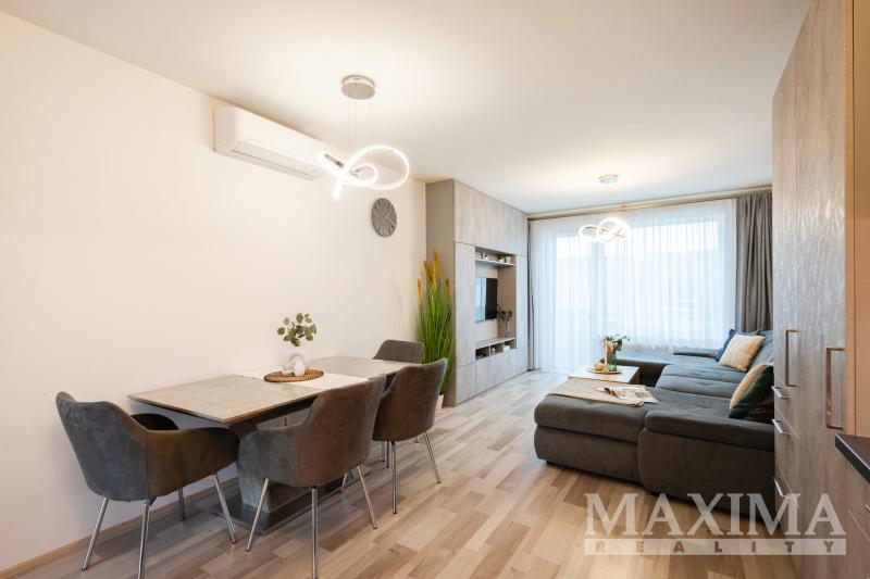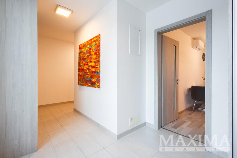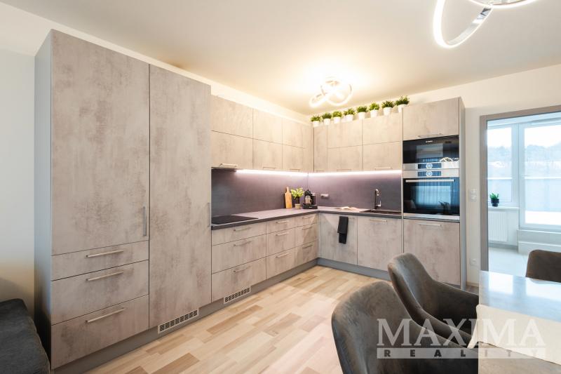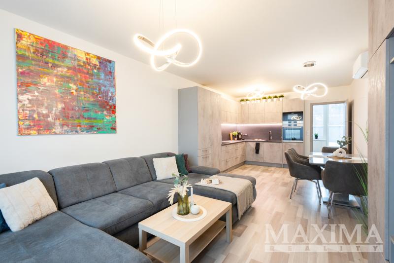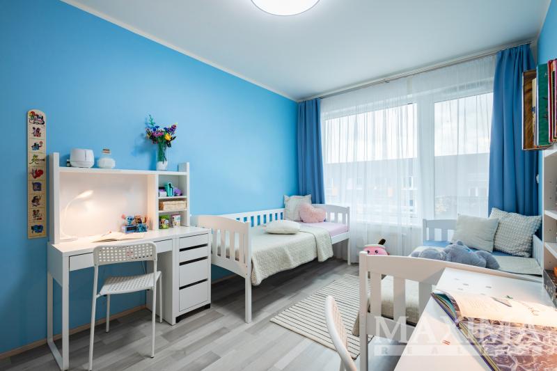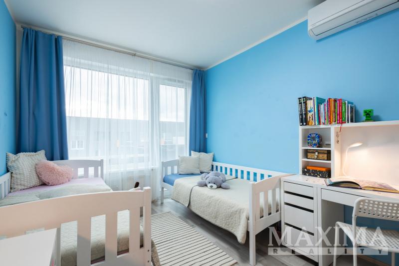 Dispozici bytu tvoří obývací prostor s kuchyní o velikosti 28,7 m2 s přímým vstupem na terasu. Hlavní ložnice o výměře 12 m2 disponuje vlastní koupelnou o velikosti 4,2 m2. Dva další pokoje (12,5 a 13,3 m2) jsou vhodné jako dětské pokoje nebo pracovna. K dispozici je druhá koupelna, komora, prostorná vstupní hala a balkon o velikosti 8,3 m2. Obývací pokoj s kuchyní i oba dětské pokoje jsou klimatizovány.