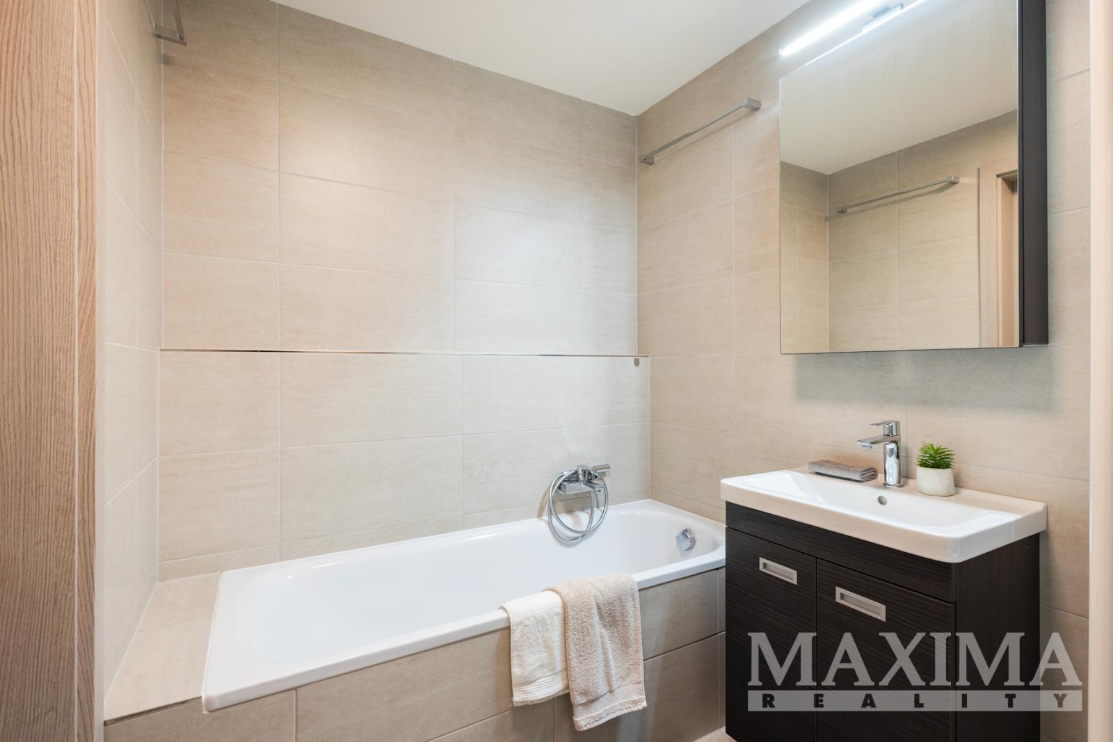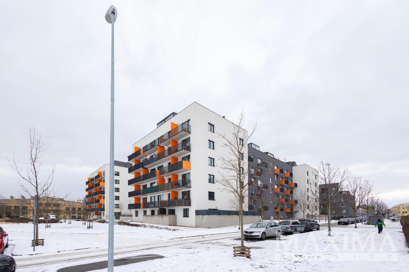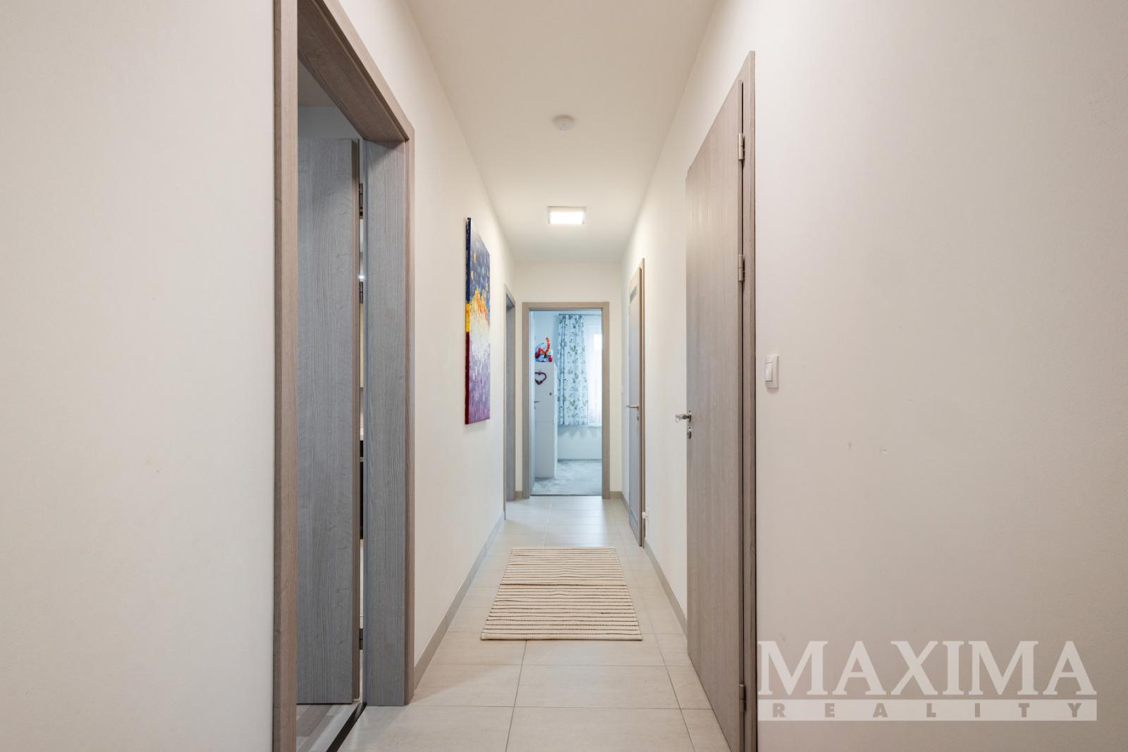 Dispozici bytu tvoří obývací prostor s kuchyní o velikosti 28,7 m2 s přímým vstupem na terasu. Hlavní ložnice o výměře 12 m2 disponuje vlastní koupelnou o velikosti 4,2 m2. Dva další pokoje (12,5 a 13,3 m2) jsou vhodné jako dětské pokoje nebo pracovna. K dispozici je druhá koupelna, komora, prostorná vstupní hala a balkon o velikosti 8,3 m2. Obývací pokoj s kuchyní i oba dětské pokoje jsou klimatizovány.