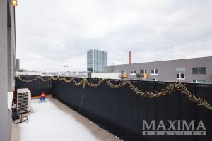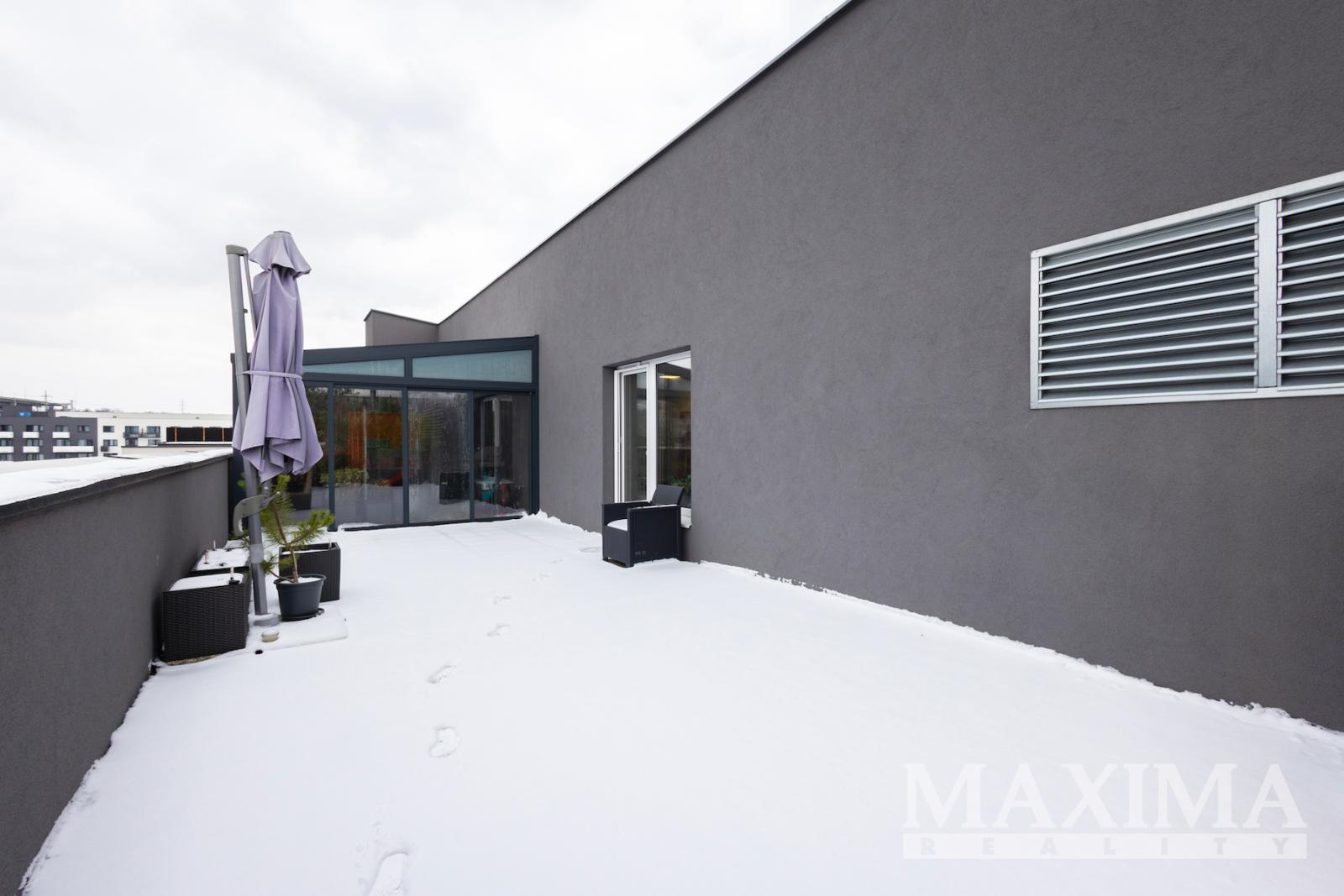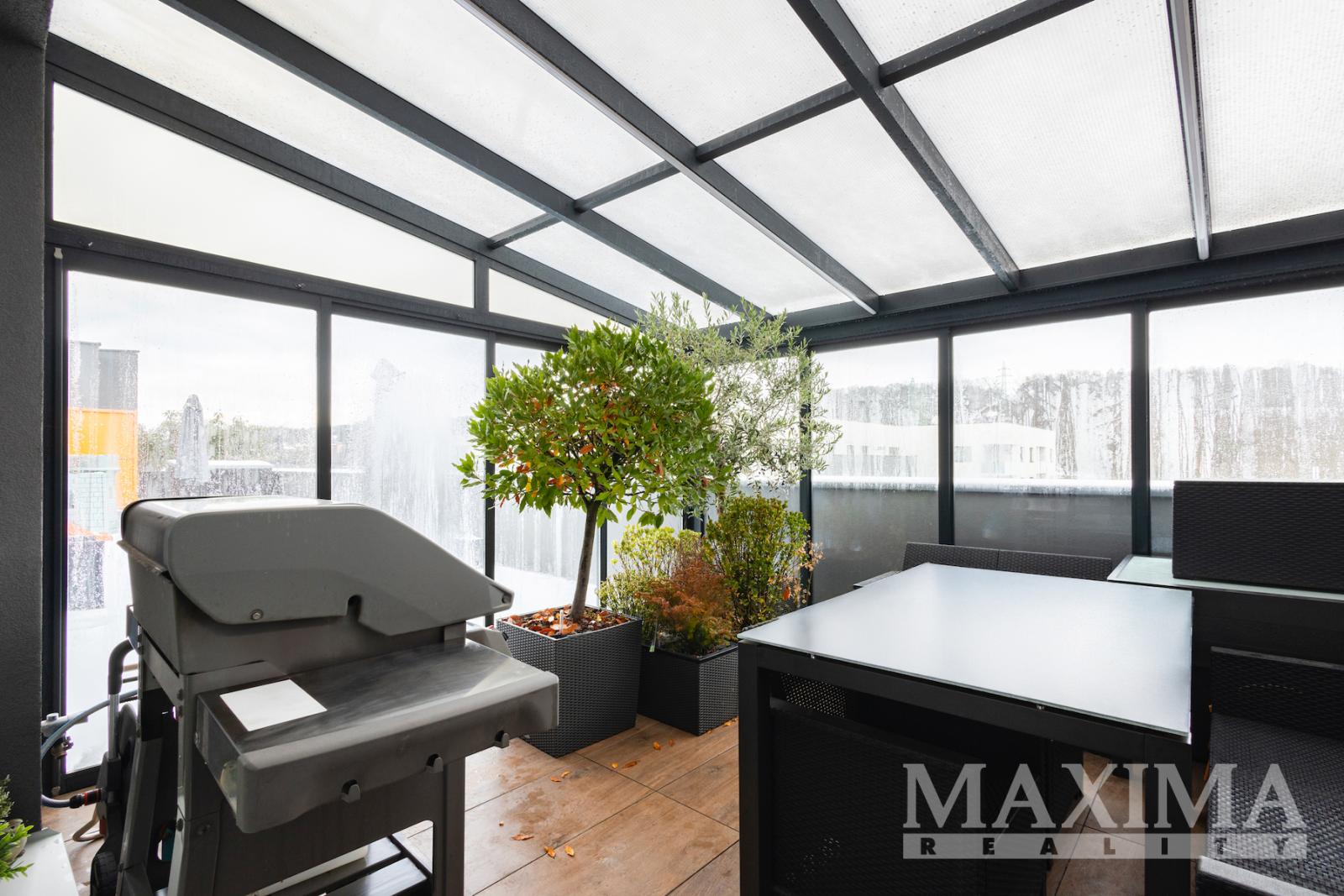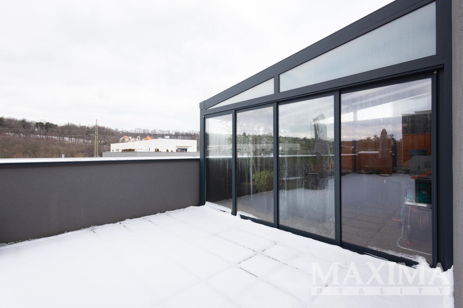 Výjimečným benefitem bytu je prostorná terasa (59,1 m2), která výrazně rozšiřuje obytný prostor a nabízí ideální místo pro relaxaci i společenská setkání. Část terasy je osazena umělým trávníkem, část velkoformátovou dlažbou. Součástí terasy je hliníková pergola o velikosti přibližně 16 m2 se zastřešením a prosklenými posuvnými stěnami, které umožňují její celoroční využití.