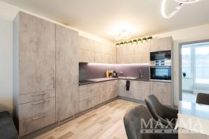 V obytných místnostech jsou položeny laminátové podlahy, v chodbě, koupelnách a komoře kvalitní dlažba. Plastová okna s trojskly zajišťují výborné tepelněizolační i akustické vlastnosti. Vytápění i ohřev teplé vody jsou řešeny centrálně dálkově. Interiérové dveře jsou značky Sapeli. Kuchyňská linka na míru je vybavena spotřebiči značky Bosch, stejně jako pračka a sušička. Byt je kompletně zařízen vestavěným nábytkem.