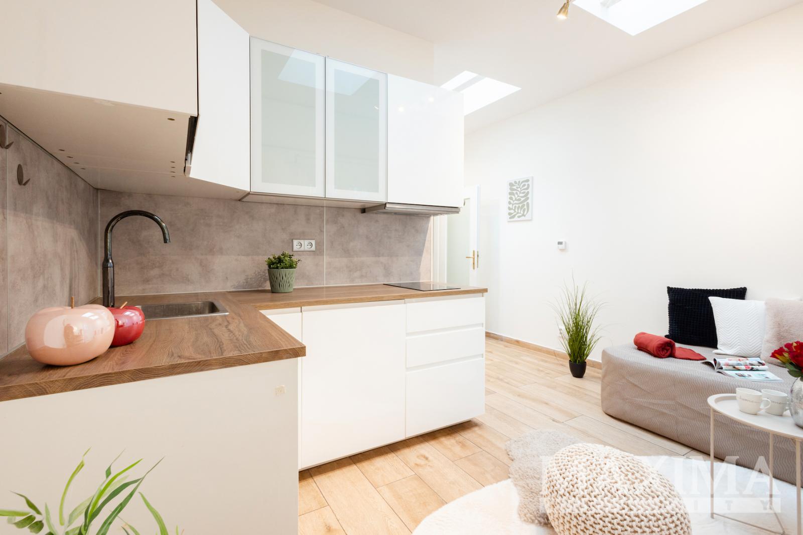 Součástí ateliéru je kuchyňský kout s kuchyňskou linkou, který je prakticky začleněn do hlavního obytného prostoru.