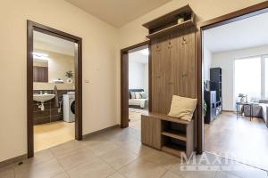 Dispozice bytu je praktická, funkční a promyšlená. Prostorná vstupní hala (9,15 m2) poskytuje dostatek úložného prostoru a plynule navazuje na všechny místnosti. Srdcem bytu je světlý obývací pokoj s kuchyňským koutem (29,39 m2), který nabízí přímý vstup na balkon o velikosti 6 m2, ideální pro ranní kávu nebo večerní relaxaci. Mezi další prostory patří ložnice (15,46 m2), koupelna s toaletou (6,53 m2) a praktická komora (1,32 m2).