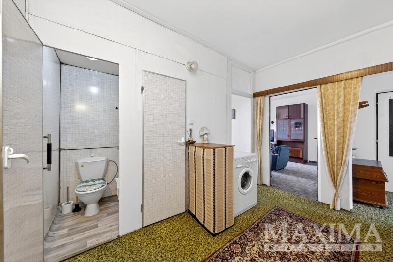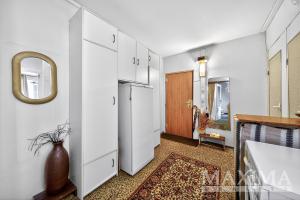 Za vstupními dveřmi bytu je čtvercová hala, ze které vedou dveře do koupelny a na toaletu a chodba do moderně zrekonstruované kuchyně s jídelním stolem. Další dveře nás zavedou do prostorného obývacího pokoje.