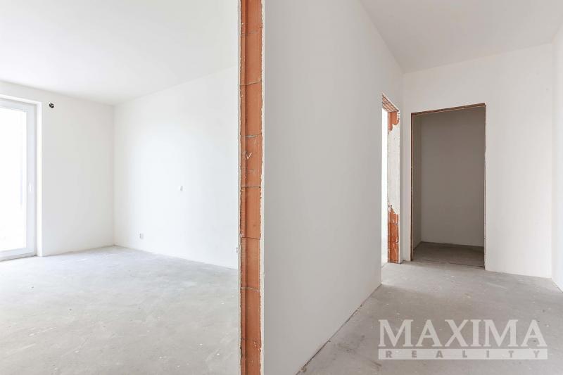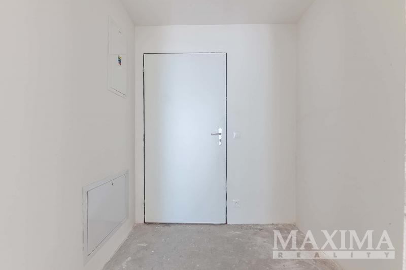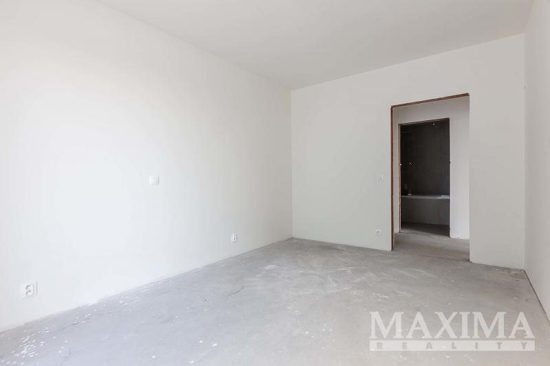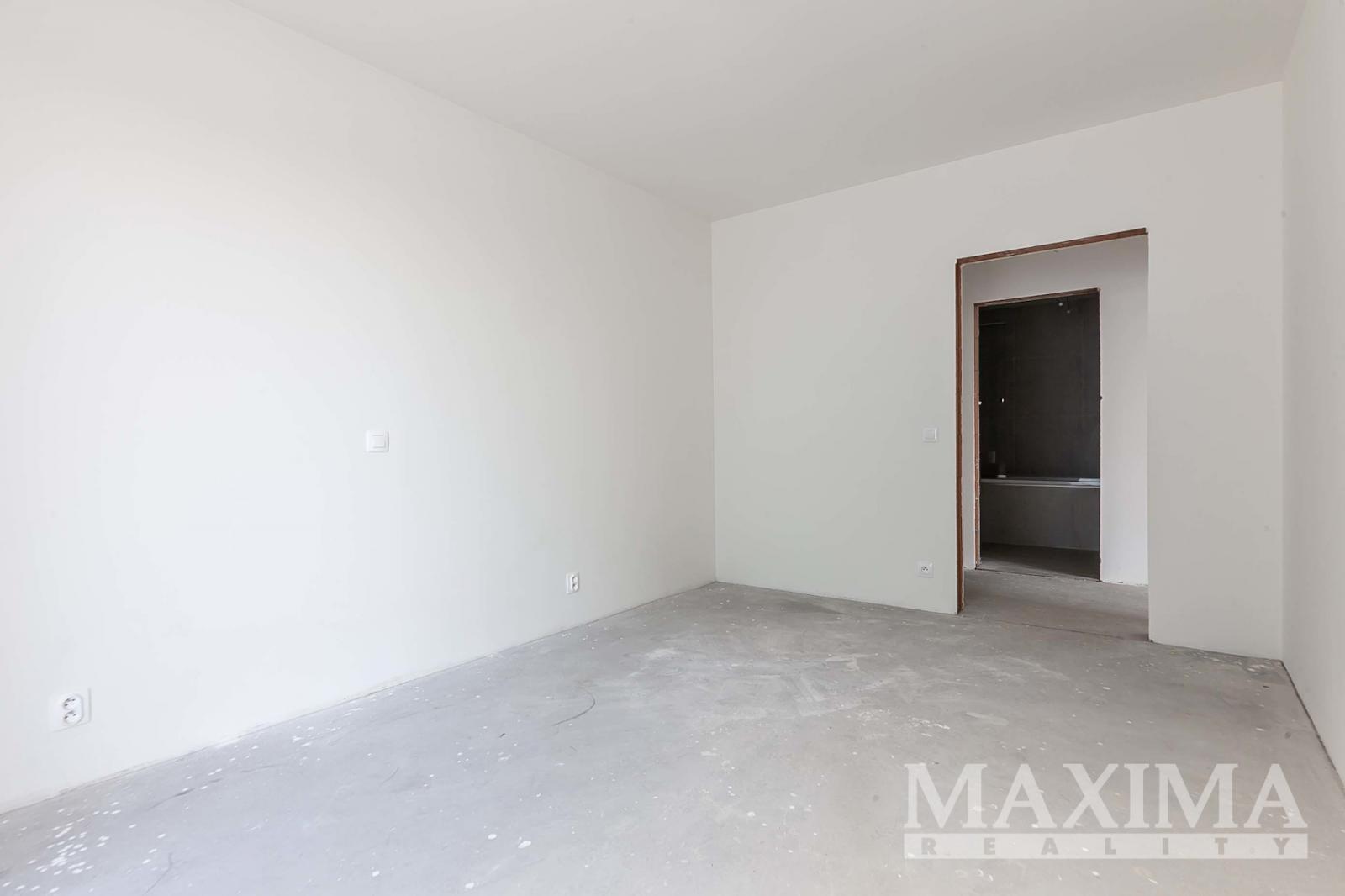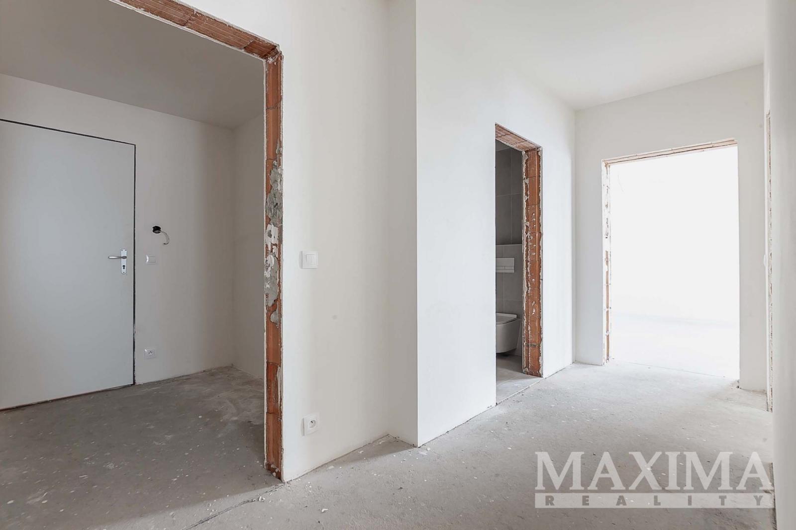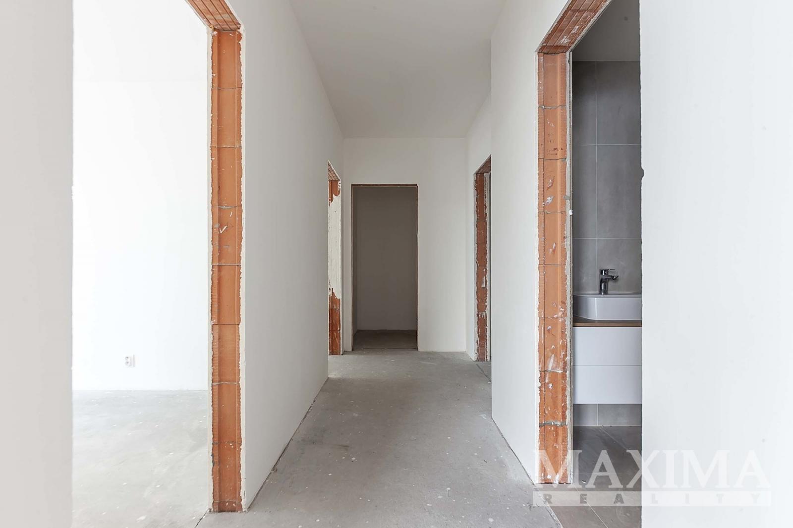 Byt je ve stavu před dokončením - koupelna je již kompletně dokončena, podlahy a interiérové dveře nejsou instalovány, což dává budoucímu majiteli možnost dokončit interiér dle vlastních představ.