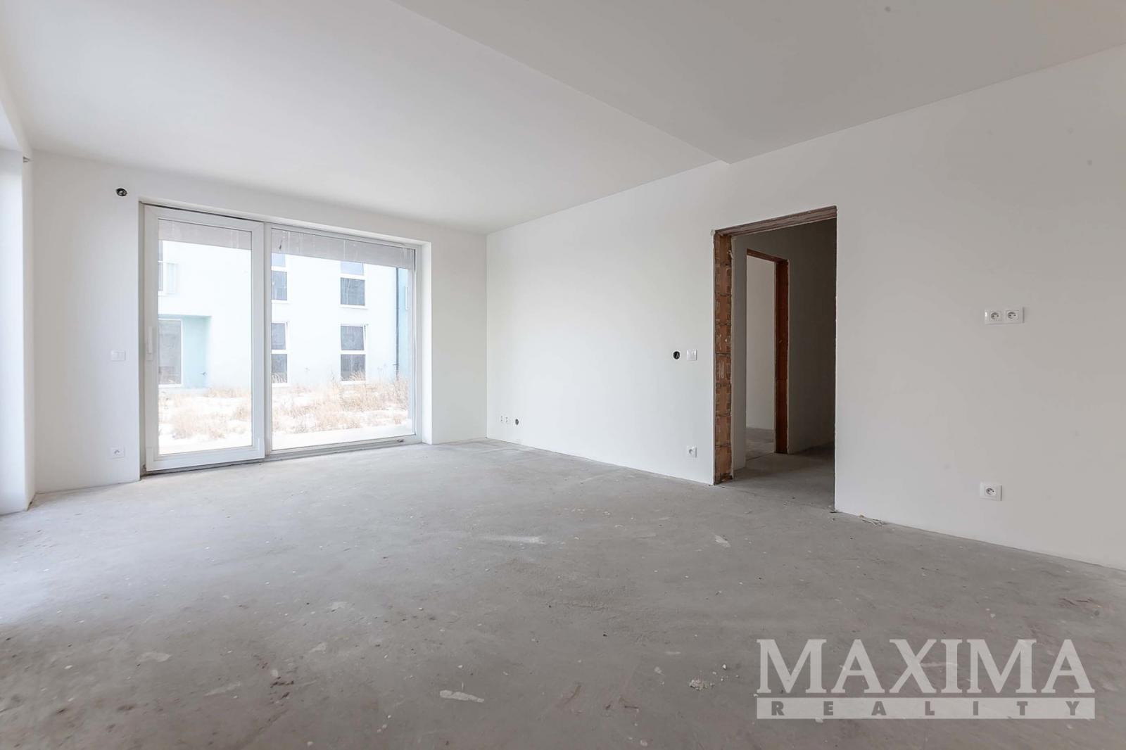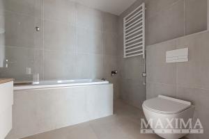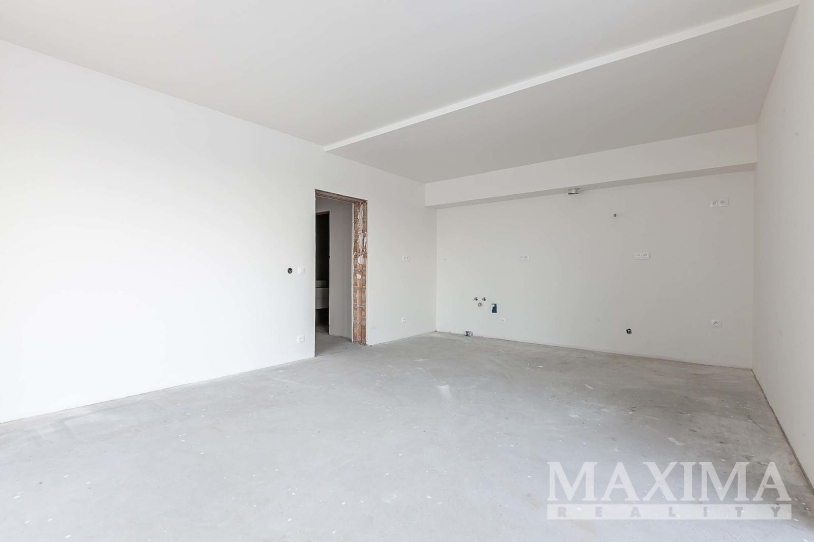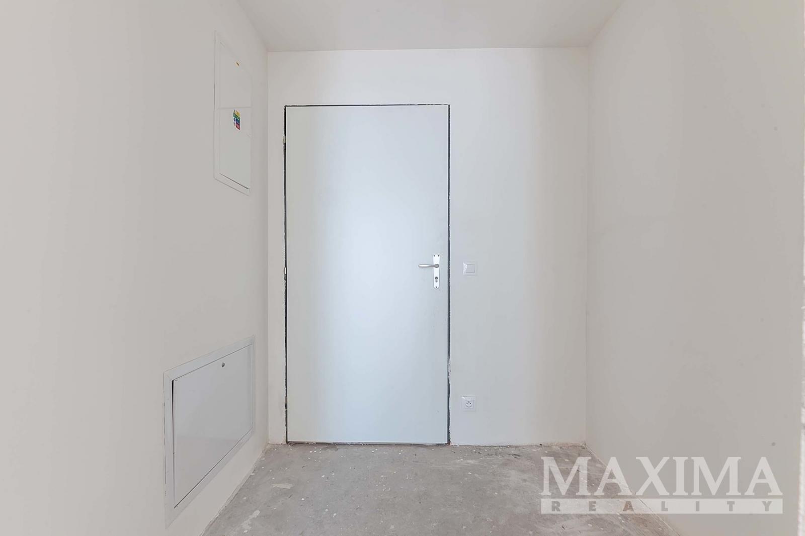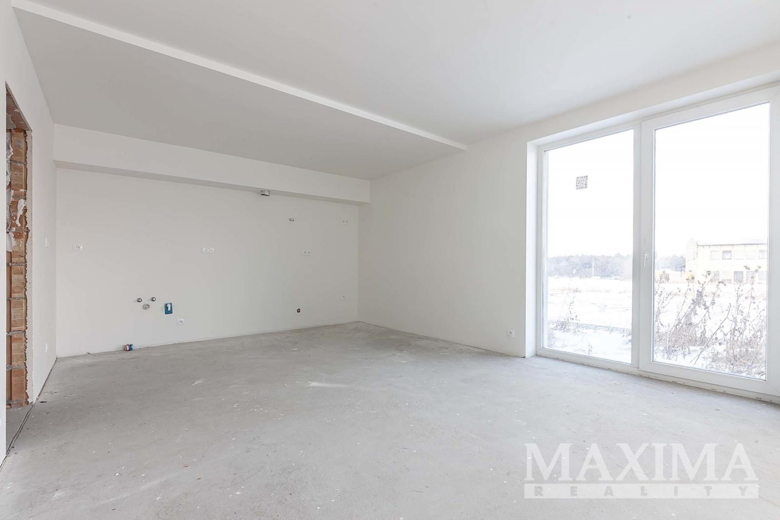 Byt je ve stavu před dokončením - koupelna je již kompletně dokončena, podlahy a interiérové dveře nejsou instalovány, což dává budoucímu majiteli možnost dokončit interiér dle vlastních představ.