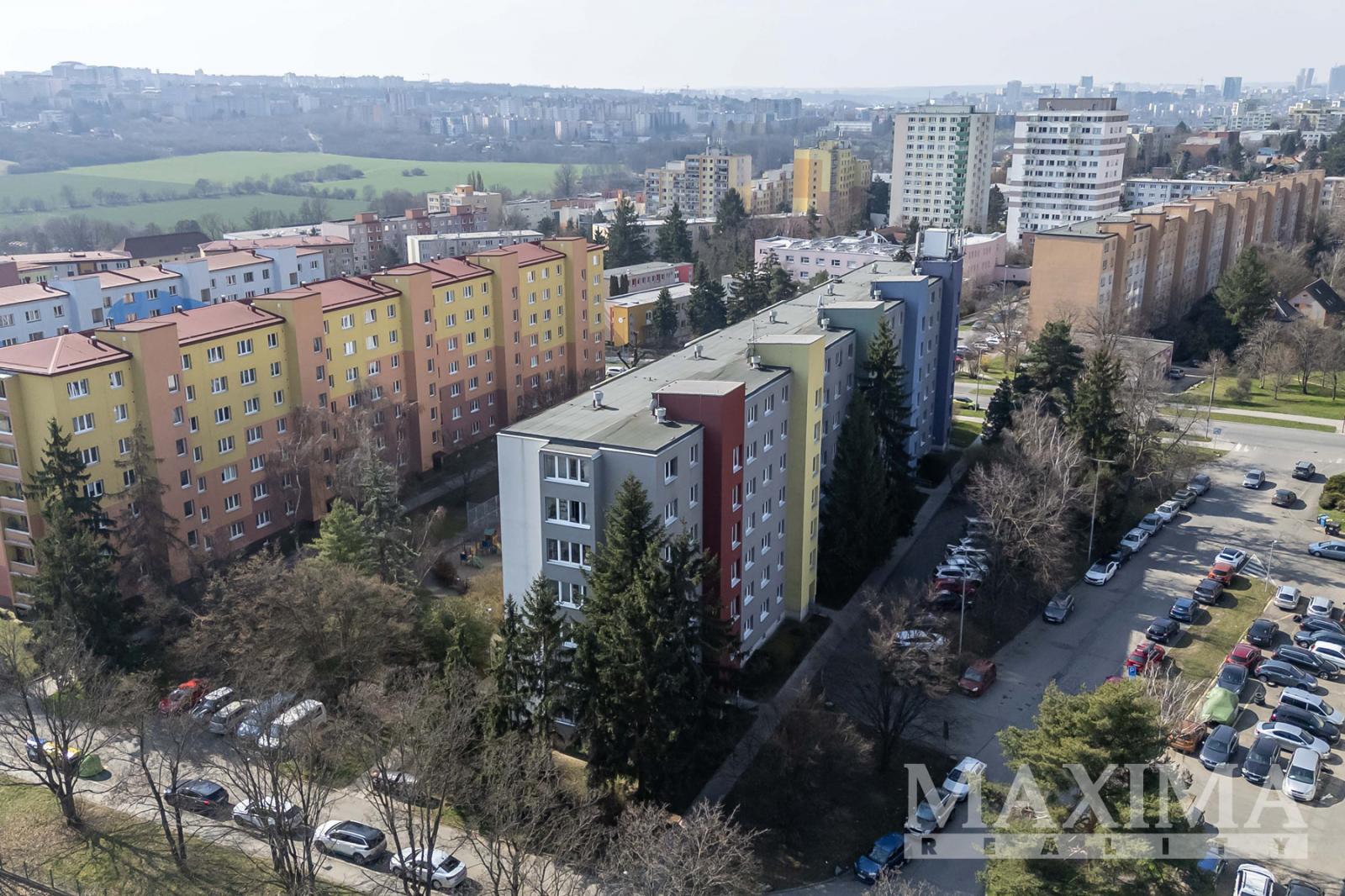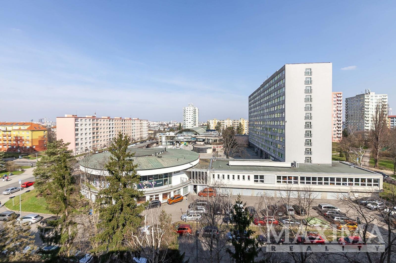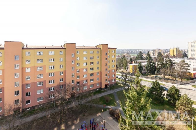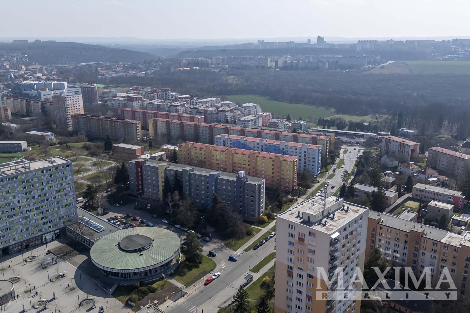 - z okna kuchyně a dalšího pokoje otevřený výhled směrem na Koloseum a OC Cíl, při jihovýchodní straně bytového domu parková úprava a hřiště na míčové hry.
