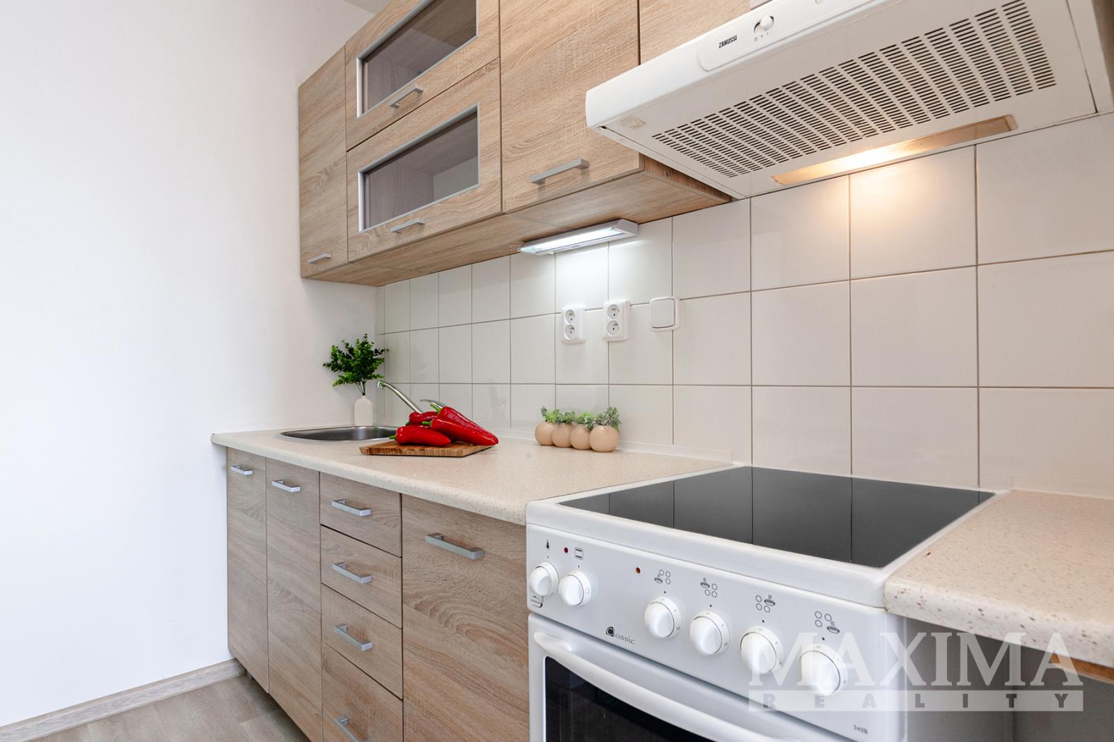 Byt se prodává částečně zařízený. Najdete zde vybavenou kuchyňskou linku s elektrickou troubou, varnou deskou, digestoří a lednicí s mrazákem, stůl se židlemi, rám postele s rošty, konferenční stolek, pračka.