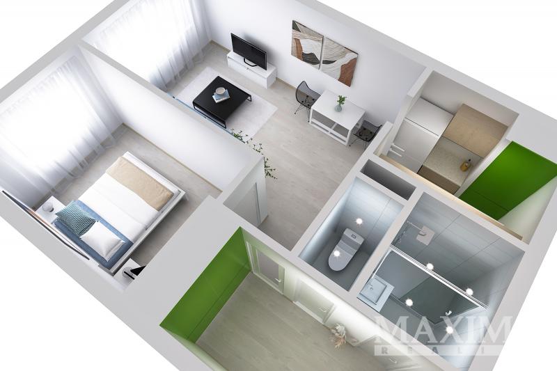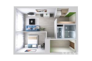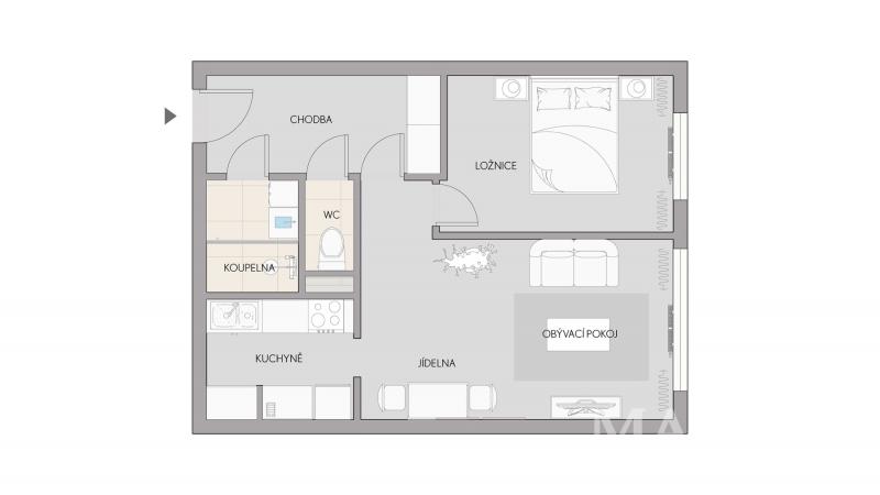 Dispozičně byt nabízí prostornou vstupní chodbu s vestavěnými skříněmi, samostatnou ložnici, obývací pokoj s kuchyňským koutem a dále koupelnu se sprchovým koutem a oddělenou toaletu. Součástí prodeje je také praktická sklepní kóje (komora) umístěná ve 4. podlaží domu.