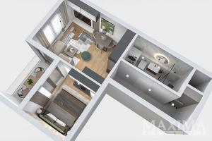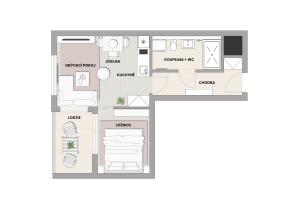 Byt disponuje vstupní chodbou, obývacím pokojem s kuchyňským koutem, ložnicí a koupelnou se sprchovým koutem, závěsným WC, otopným žebříkem a přípravou na pračku. Kuchyňský kout má připravené rozvody pro instalaci kuchyňské linky. Byt je orientován na západ.