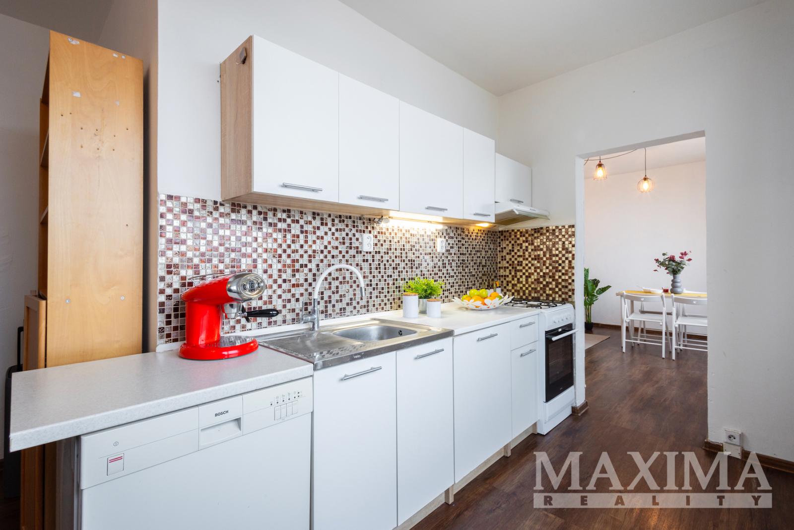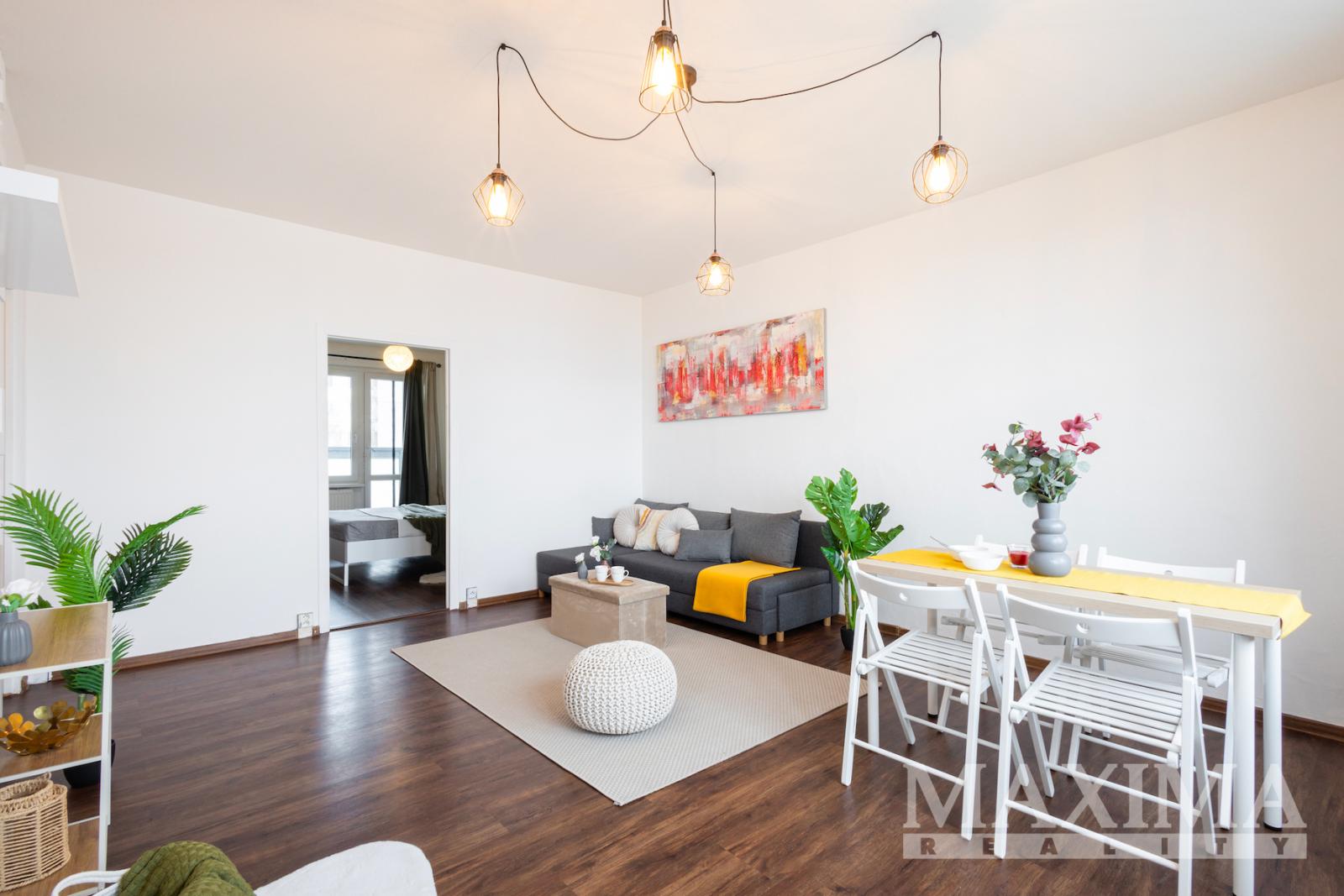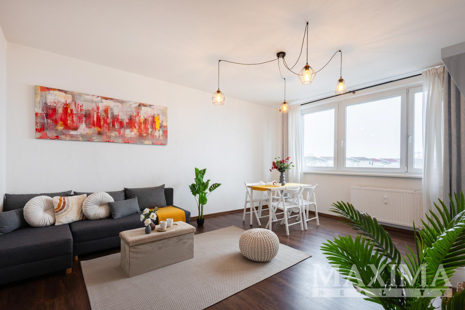 Srdcem bytu je prostorný obývací pokoj s dostatkem místa pro sedací soupravu i rodinný jídelní kout. Samostatná kuchyně s oknem je vybavena vkusnou kuchyňskou linkou se spotřebiči (lednice, trouba, digestoř, myčka) a poskytuje příjemné prostředí pro každodenní vaření.