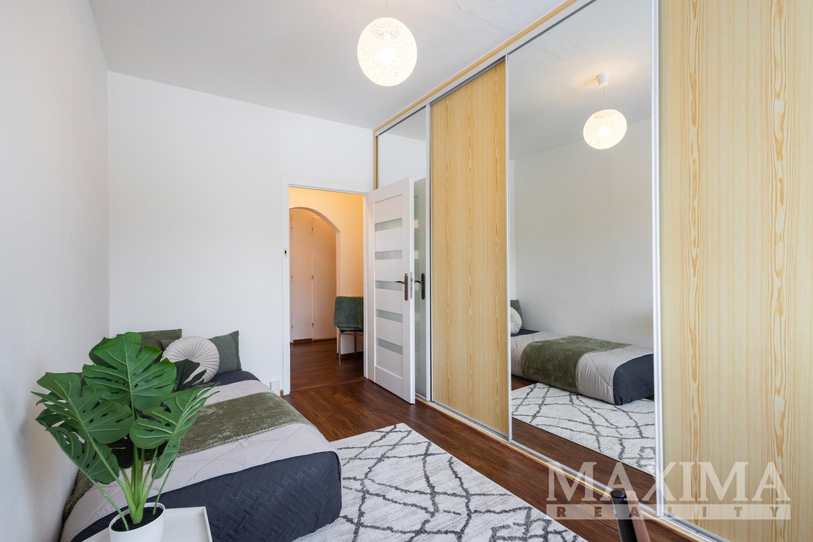 Druhý pokoj je vybaven vestavěnou šatní skříní se zrcadlem a může plnit roli dětského pokoje či samostatné pracovny.