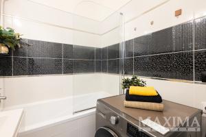 Koupelna v elegantním černobílém provedení disponuje vanou se sprchovou zástěnou, toaleta je samostatná. V celém bytě jsou položeny kvalitní vinylové podlahy a byt má nové rozvody elektřiny, což výrazně snižuje potřebu dalších investic.