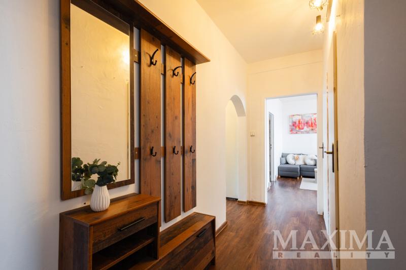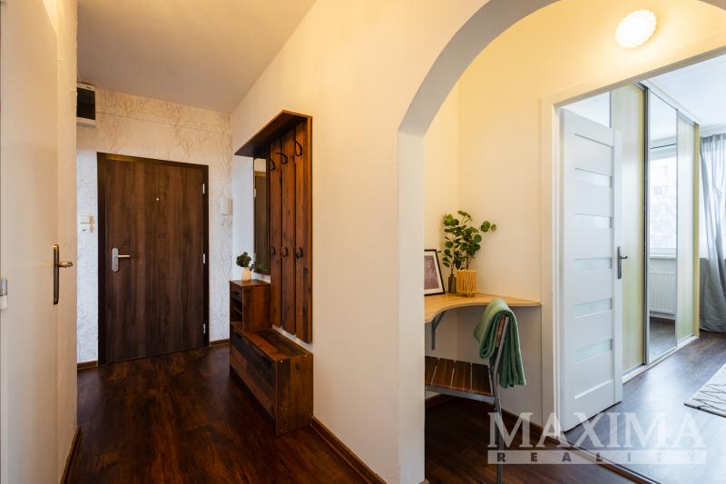 Dispozice bytu je promyšlená a nabízí dostatek prostoru pro každodenní fungování rodiny. Vstupní chodba poskytuje místo pro vestavné skříně i pracovní kout. V současnosti je zde umístěn psací stůl, který může sloužit jako domácí kancelář nebo studijní místo pro děti. Naproti se nachází velká úložná skříň.