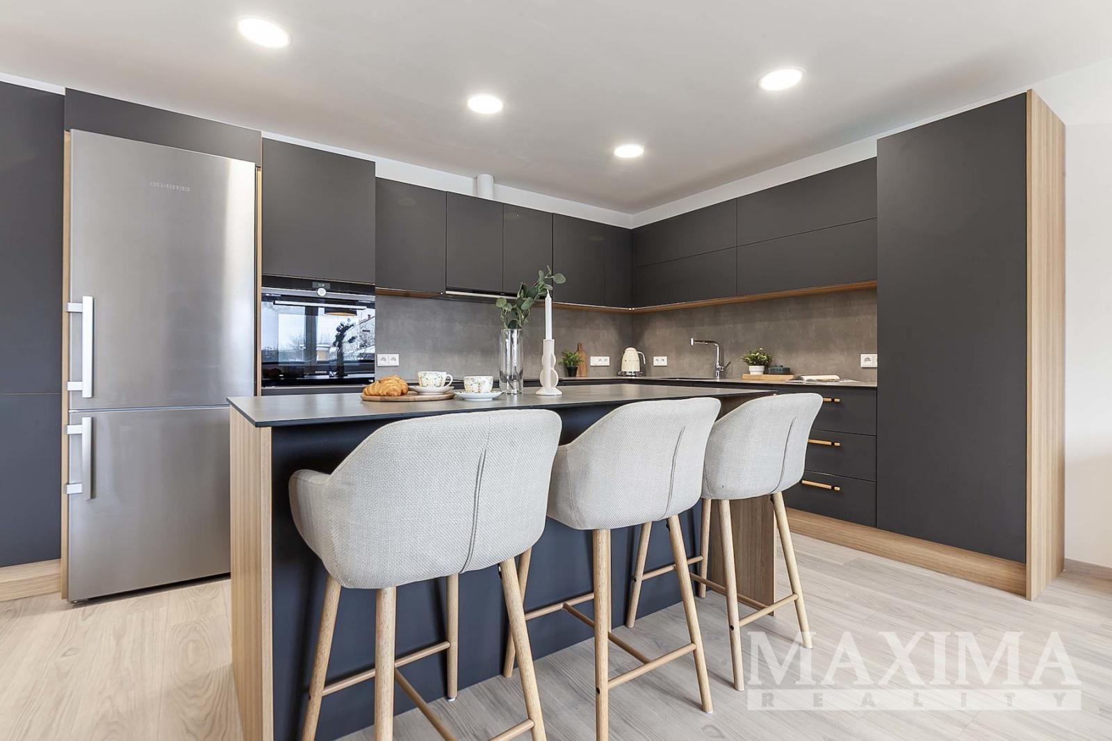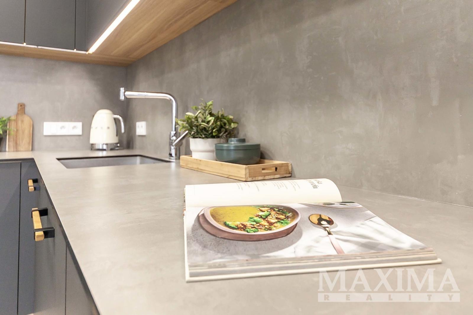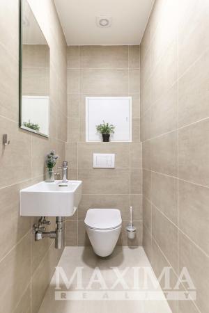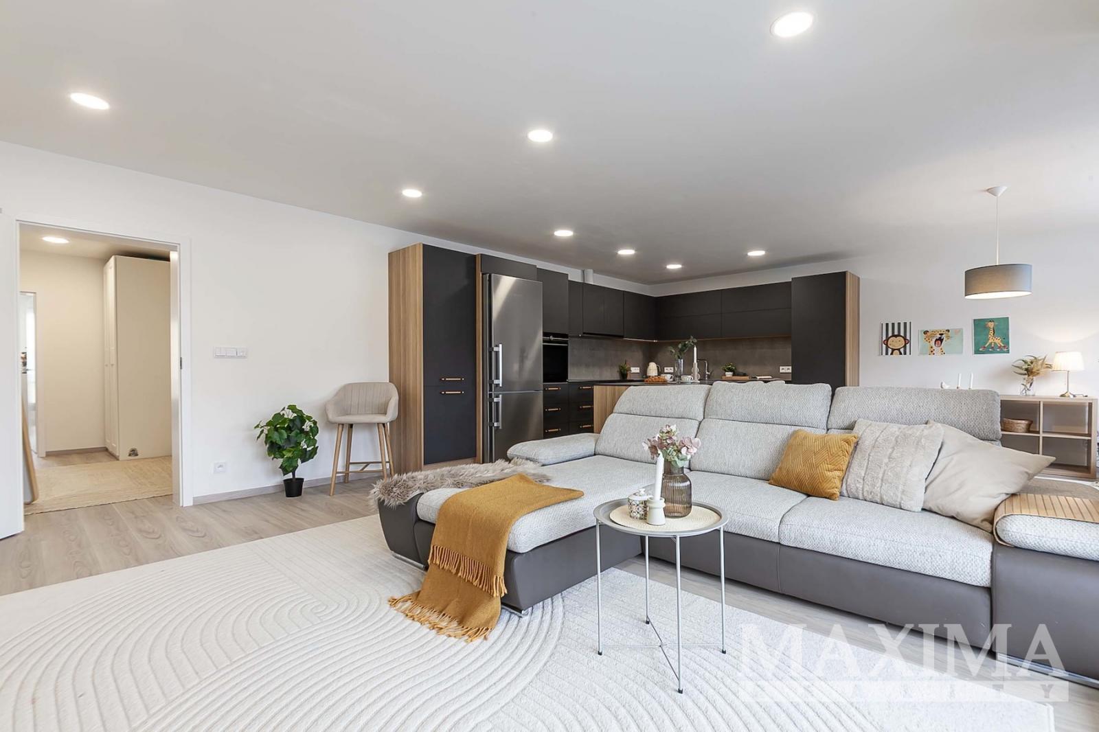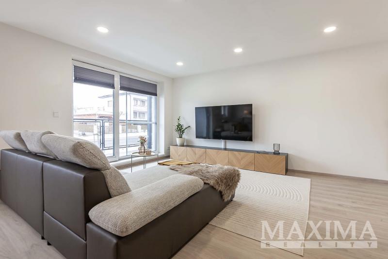 Dispozice 2+kk o celkové ploše 74,7 m2 + balkon 4,27 m2 nabízí nadstandardně řešený interiér. Dominantou bytu je vzdušný obývací pokoj (42,89 m2) propojený s moderním kuchyňským koutem na míru s ostrůvkem a vestavěnými spotřebiči, se vstupem na balkon. Dále je k dispozici prostorná ložnice (16,07 m2), koupelna (6,17 m2) s vanou, umyvadlem se skříňkami a prostorem pro pračku a sušičku, samostatné WC (1,68 m2) s umyvadlem a vstupní hala (7,85 m2).