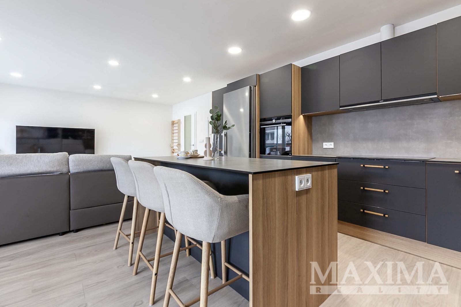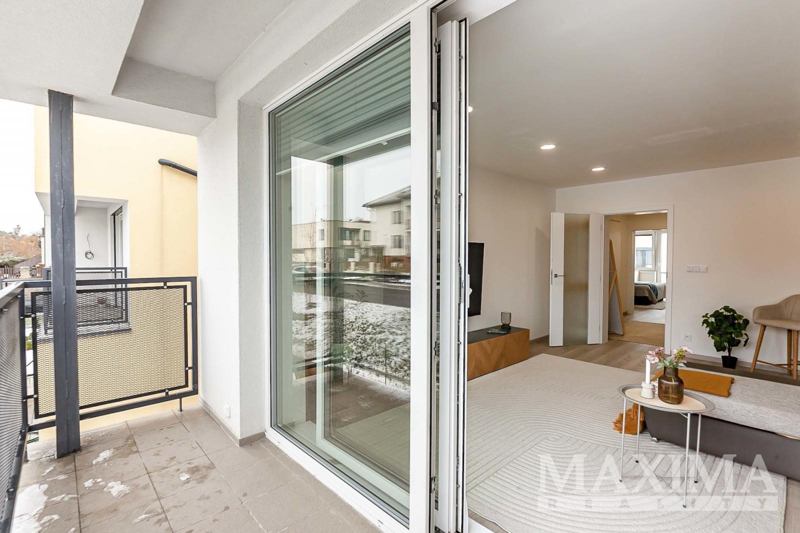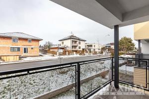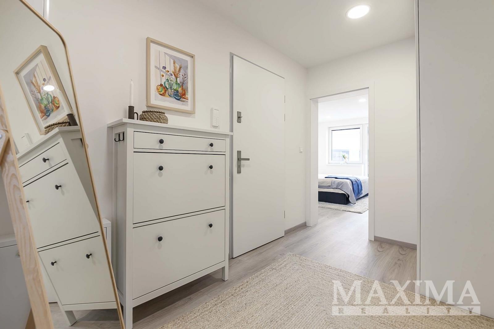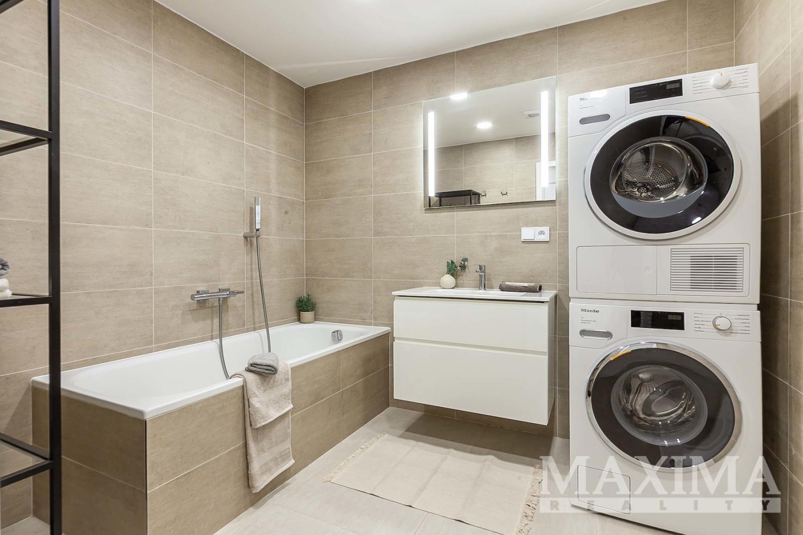 Dispozice 2+kk o celkové ploše 74,7 m2 + balkon 4,27 m2 nabízí nadstandardně řešený interiér. Dominantou bytu je vzdušný obývací pokoj (42,89 m2) propojený s moderním kuchyňským koutem na míru s ostrůvkem a vestavěnými spotřebiči, se vstupem na balkon. Dále je k dispozici prostorná ložnice (16,07 m2), koupelna (6,17 m2) s vanou, umyvadlem se skříňkami a prostorem pro pračku a sušičku, samostatné WC (1,68 m2) s umyvadlem a vstupní hala (7,85 m2).