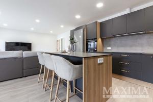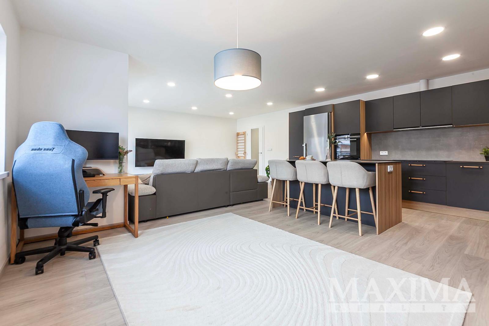 Interiér je vybaven plastovými okny s izolačním trojsklem včetně interiérových žaluzií, kvalitními vinylovými podlahami a dlažbou. O tepelný komfort se stará podlahové vytápění s oddělenými topnými okruhy, které umožňují individuální regulaci teploty v jednotlivých místnostech.