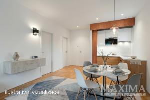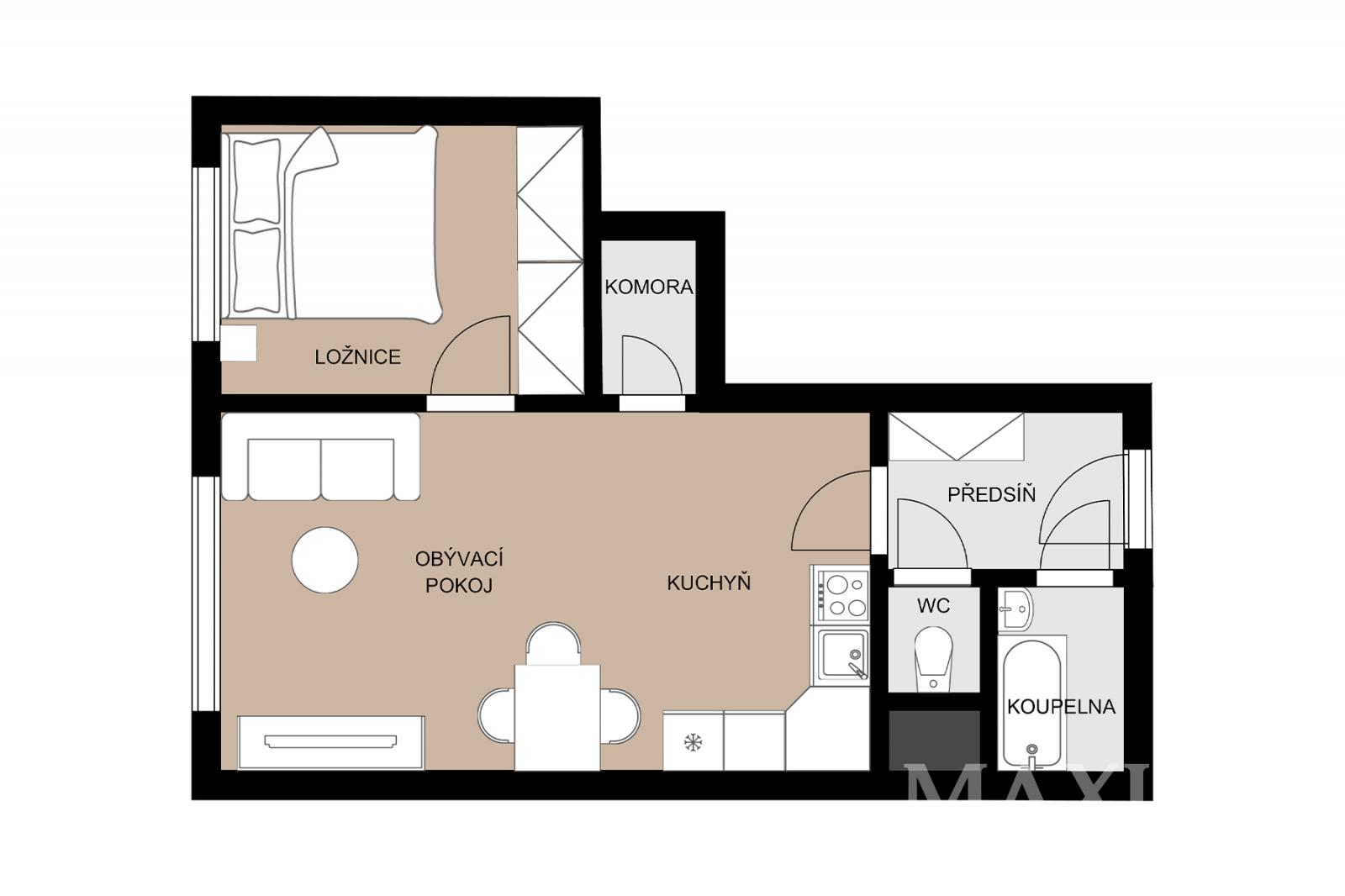 Dispozice bytu tvoří kuchyň o velikosti 1,18 m2, předsíň 3,70 m2, obývací pokoj o výměře 19,07 m2, druhý pokoj o velikosti 12,05 m2, koupelna s WC o ploše 3,17 m2 a praktická komora o velikosti 1,97 m2 umístěná přímo v bytě.