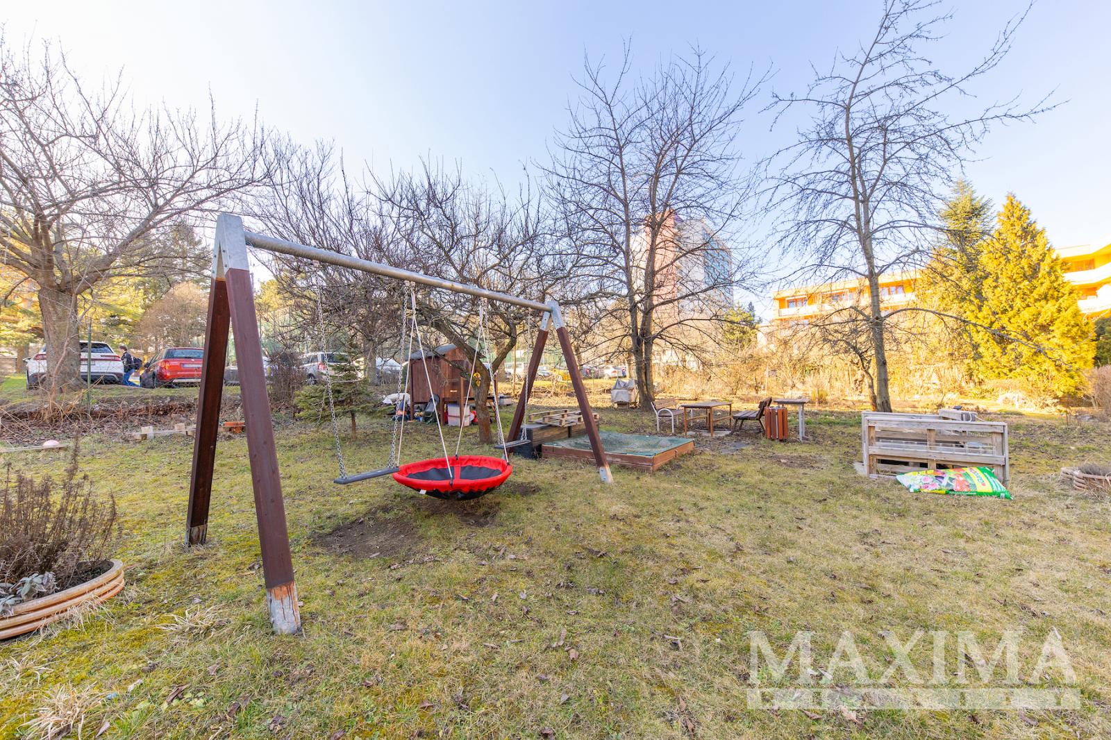 Za domem se nachází rozsáhlá zahrada, využívaná společně - najdete ze prostor pro relax, pěstování i zázemí pro děti. K tomuto bytu navíc náleží i její konkrétní část, kterou si majitelé pořídili ke svému užívání. Tato kombinace soukromé i společné zeleně přináší klid a zázemí, které je u bytů v této lokalitě spíše vyjímečné.