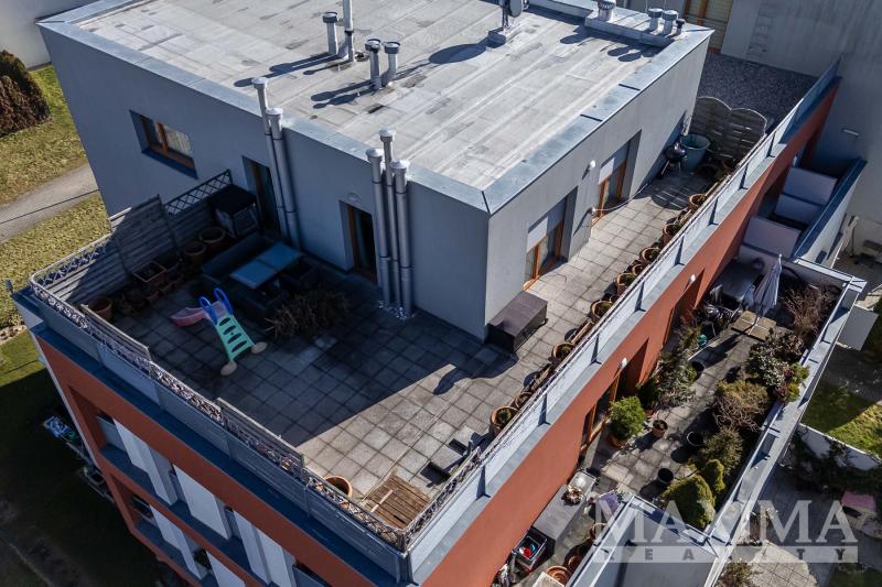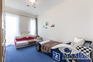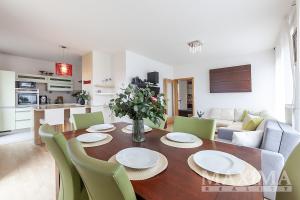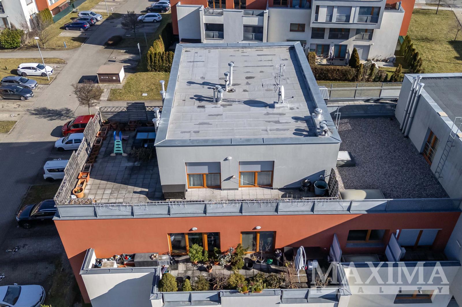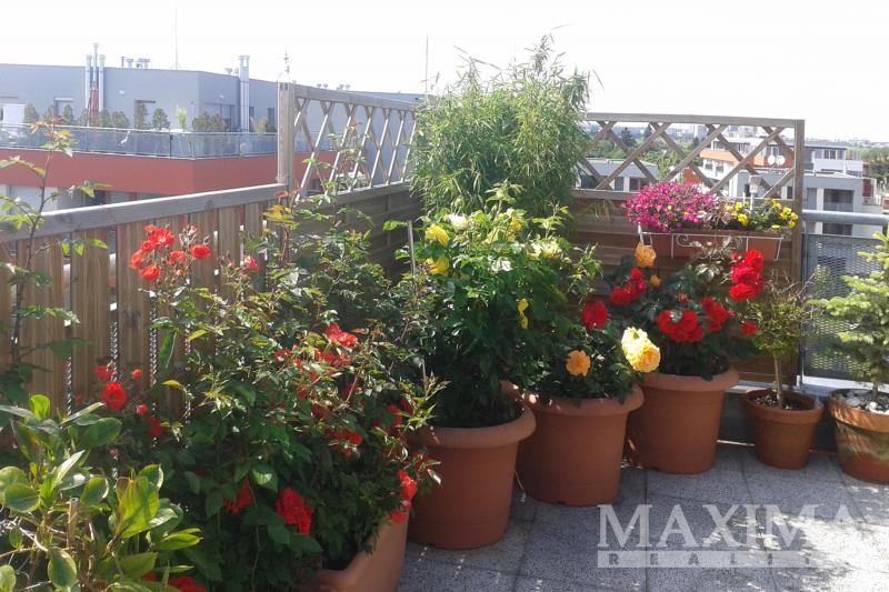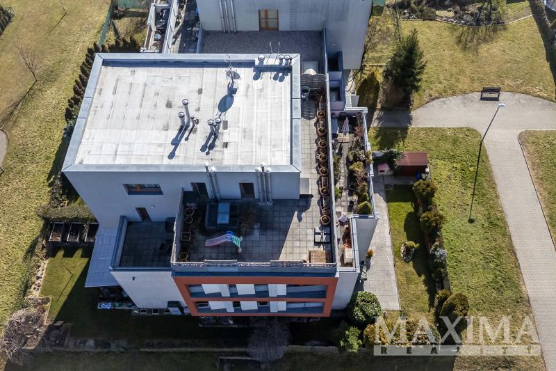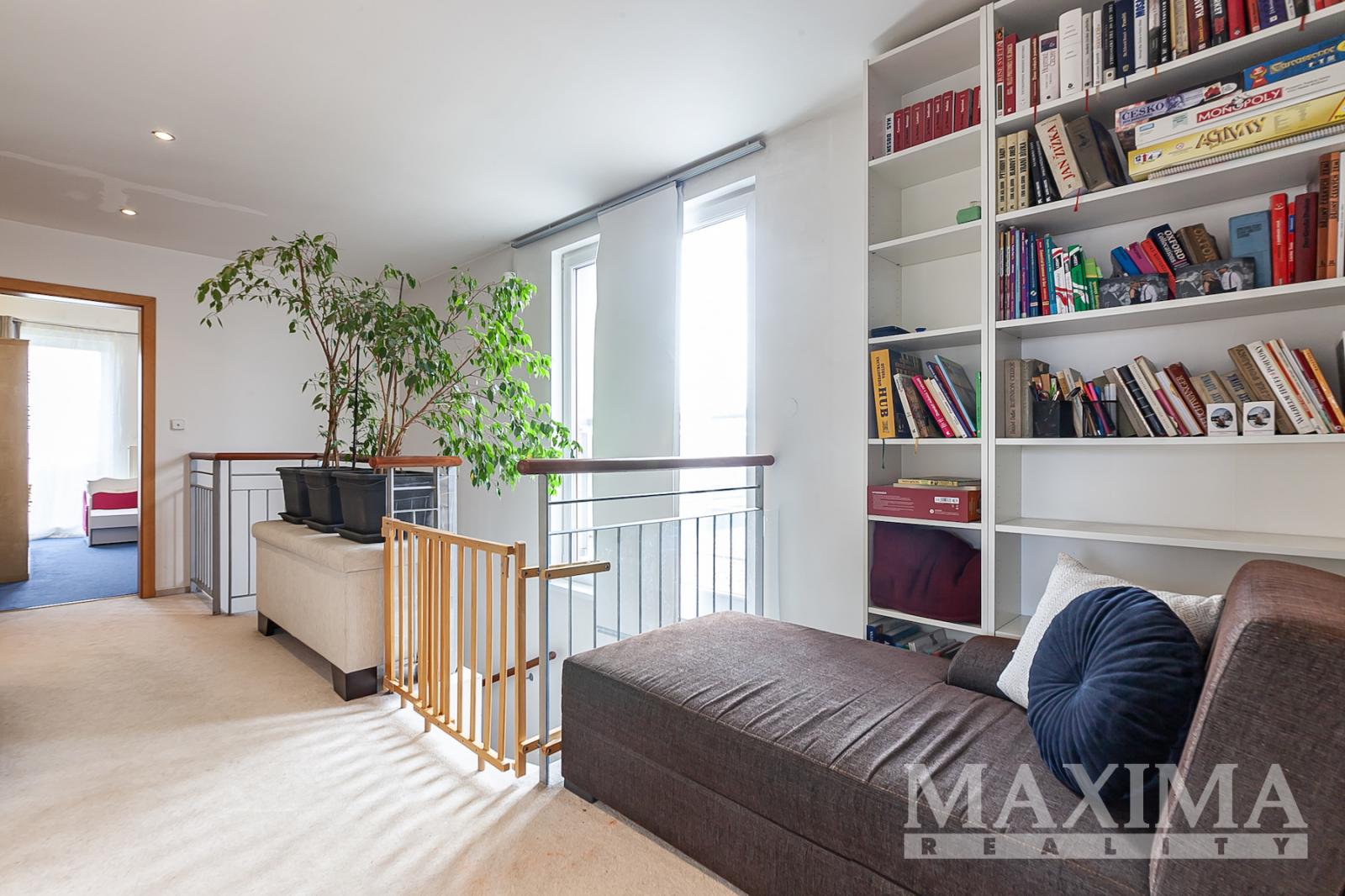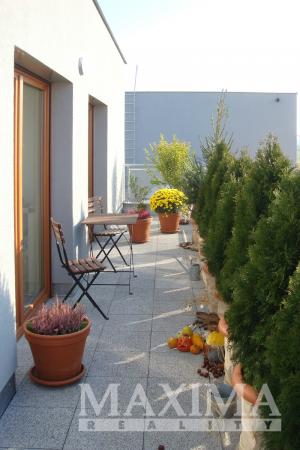 Exkluzivní nabídka jedinečné nemovitosti: prostorný byt 4+kk (celková plocha 179 m2) s pohledově chráněnou rozlehlou terasou, se značným odstupem od okolní zástavby, s otevřeným výhledem, lodžií, garáží a dalším parkovacím místem. Komfortní bydlení v metropoli s parametry bydlení v rodinném domě. Základní dispozice 4+kk/T/L, dále 2 koupelny, komora, technická místnost, hala s knihovnou, vstupní hala se šatnou. V suterénu velký sklep a garážové místo. Jednotka s celkovou plochou 179 m2: 113,3 m2 (vnitřní plocha bytu), 62,5 m2 (terasa), 2,8 m2 (lodžie), je situována ve 3. a 4. NP komorního bytového domu. Byt je uspořádán mezonetově tak, že vstupní podlaží reprezentuje pouze vstupní hala se šatnou a komorou, oddělená bezpečnostními dveřmi od společných prostor komorního bytového domu. V horním podlaží mezonetu se rozkládá v naprostém soukromí obytná zóna bytu s terasou a lodžií. Hala s knihovnou umožňuje vstup do společenské zóny, kterou tvoří obývací pokoj (30,8 m2) s jídelnou a kuchyní, provázaný francouzskými okny s terasou (62,4 m2) i vstup do intimní zóny, kterou tvoří pokoj (14 m2) s východně orientovanou lodžií (2,8 m2) a další 2 pokoje (10,9 m2 a 11,1 m2). Dispozici tohoto podlaží doplňují 2 koupelny, 2 WC a komora/technická místnost s pračkou atd. Příslušenství jednotky tvoří sklep (3,7 m2) v 1.PP. Pohodlné parkování 2 aut garantuje garážové místo a venkovní parkovací místo. Bydlení s mimořádným soukromím v obytné čtvrti s parkovou úpravou, rychlou dostupností centra metropole, současně v sousedství přírody a dosahu vybavenosti. Nemovitost je nabízena výhradně naší kanceláří. Hypotéka lze, zařídíme nejoptimálnější profinancování.