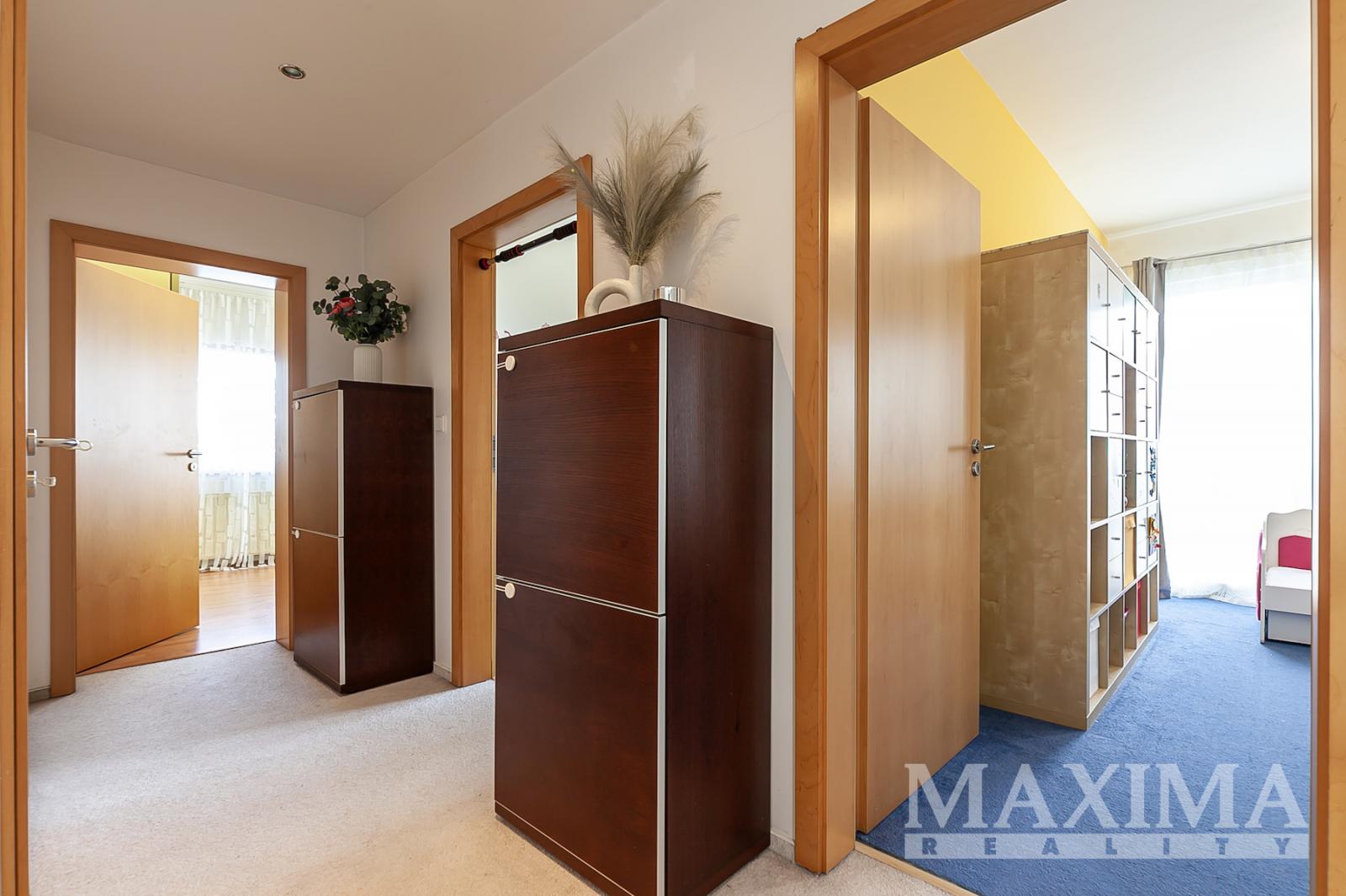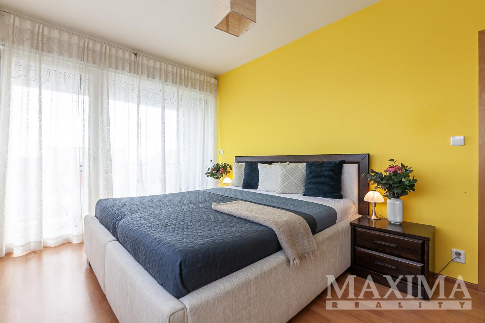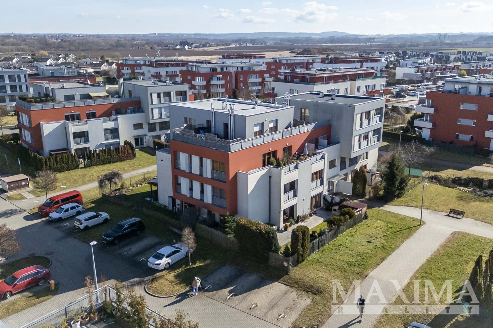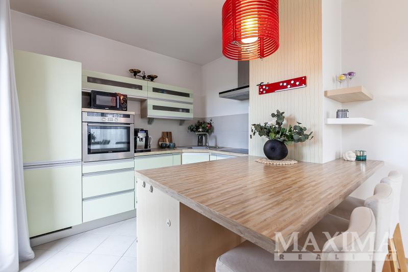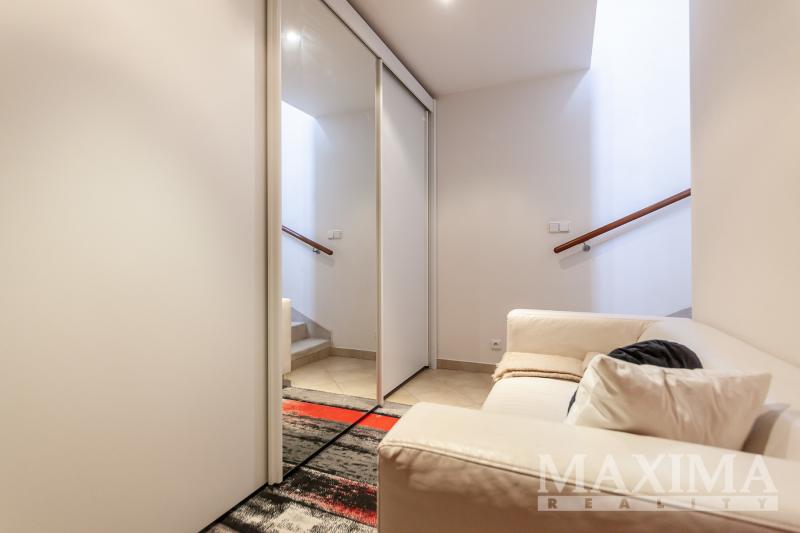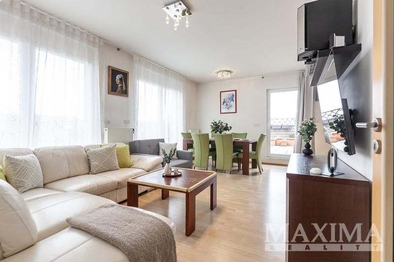 Exkluzivní nabídka jedinečné nemovitosti: prostorný byt 4+kk (celková plocha 179 m2) s pohledově chráněnou rozlehlou terasou, se značným odstupem od okolní zástavby, s otevřeným výhledem, lodžií, garáží a dalším parkovacím místem. Komfortní bydlení v metropoli s parametry bydlení v rodinném domě. Základní dispozice 4+kk/T/L, dále 2 koupelny, komora, technická místnost, hala s knihovnou, vstupní hala se šatnou. V suterénu velký sklep a garážové místo. Jednotka s celkovou plochou 179 m2: 113,3 m2 (vnitřní plocha bytu), 62,5 m2 (terasa), 2,8 m2 (lodžie), je situována ve 3. a 4. NP komorního bytového domu. Byt je uspořádán mezonetově tak, že vstupní podlaží reprezentuje pouze vstupní hala se šatnou a komorou, oddělená bezpečnostními dveřmi od společných prostor komorního bytového domu. V horním podlaží mezonetu se rozkládá v naprostém soukromí obytná zóna bytu s terasou a lodžií. Hala s knihovnou umožňuje vstup do společenské zóny, kterou tvoří obývací pokoj (30,8 m2) s jídelnou a kuchyní, provázaný francouzskými okny s terasou (62,4 m2) i vstup do intimní zóny, kterou tvoří pokoj (14 m2) s východně orientovanou lodžií (2,8 m2) a další 2 pokoje (10,9 m2 a 11,1 m2). Dispozici tohoto podlaží doplňují 2 koupelny, 2 WC a komora/technická místnost s pračkou atd. Příslušenství jednotky tvoří sklep (3,7 m2) v 1.PP. Pohodlné parkování 2 aut garantuje garážové místo a venkovní parkovací místo. Bydlení s mimořádným soukromím v obytné čtvrti s parkovou úpravou, rychlou dostupností centra metropole, současně v sousedství přírody a dosahu vybavenosti. Nemovitost je nabízena výhradně naší kanceláří. Hypotéka lze, zařídíme nejoptimálnější profinancování.