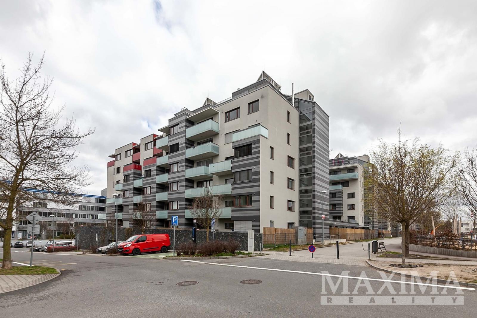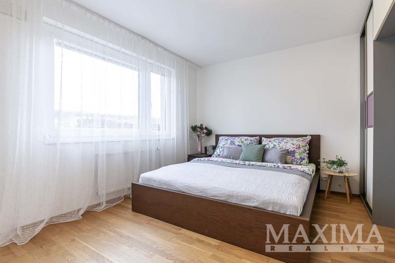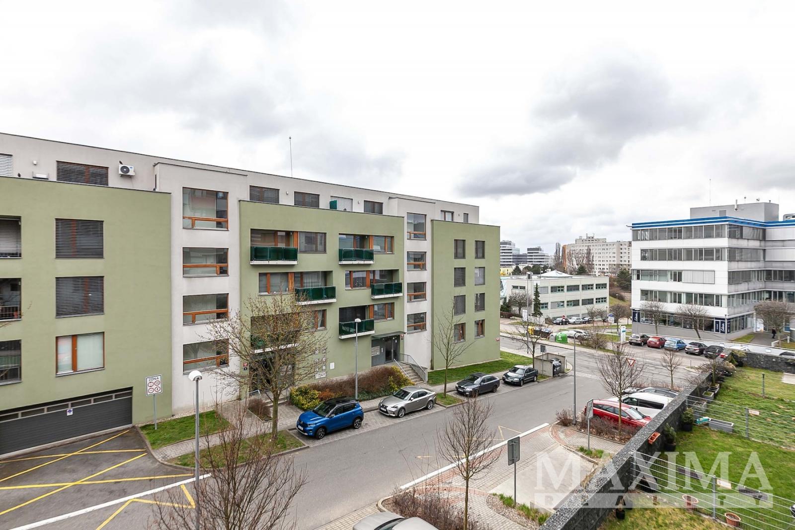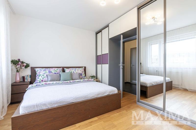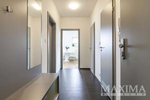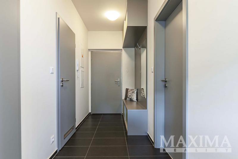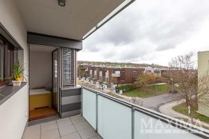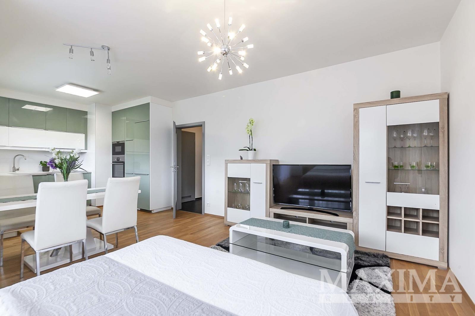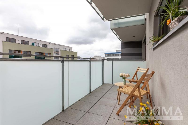 Dominantou bytu je světlý obývací pokoj o velikosti 27,6 m2, který je propojen s kuchyňským a jídelním koutem a nabízí přímý vstup na JV orientovaný balkon s příjemným výhledem do moderního okolí. Elegantní kuchyňská linka na míru je vybavena kvalitními vestavěnými spotřebiči. Dále je k dispozici ložnice o velikosti 14,1 m2, koupelna o velikosti 4 m2 s vanou se sprchovací zástěnou a prostorem pro pračku i sušičku, samostatná toaleta a vstupní předsíň.