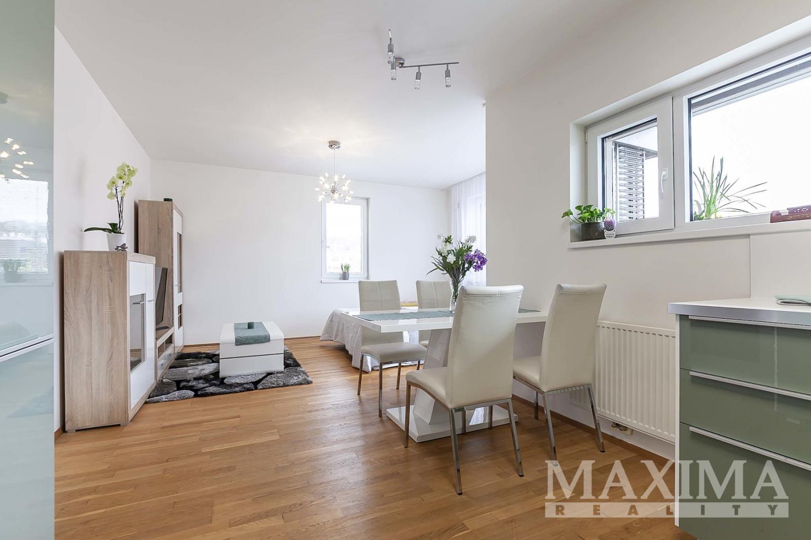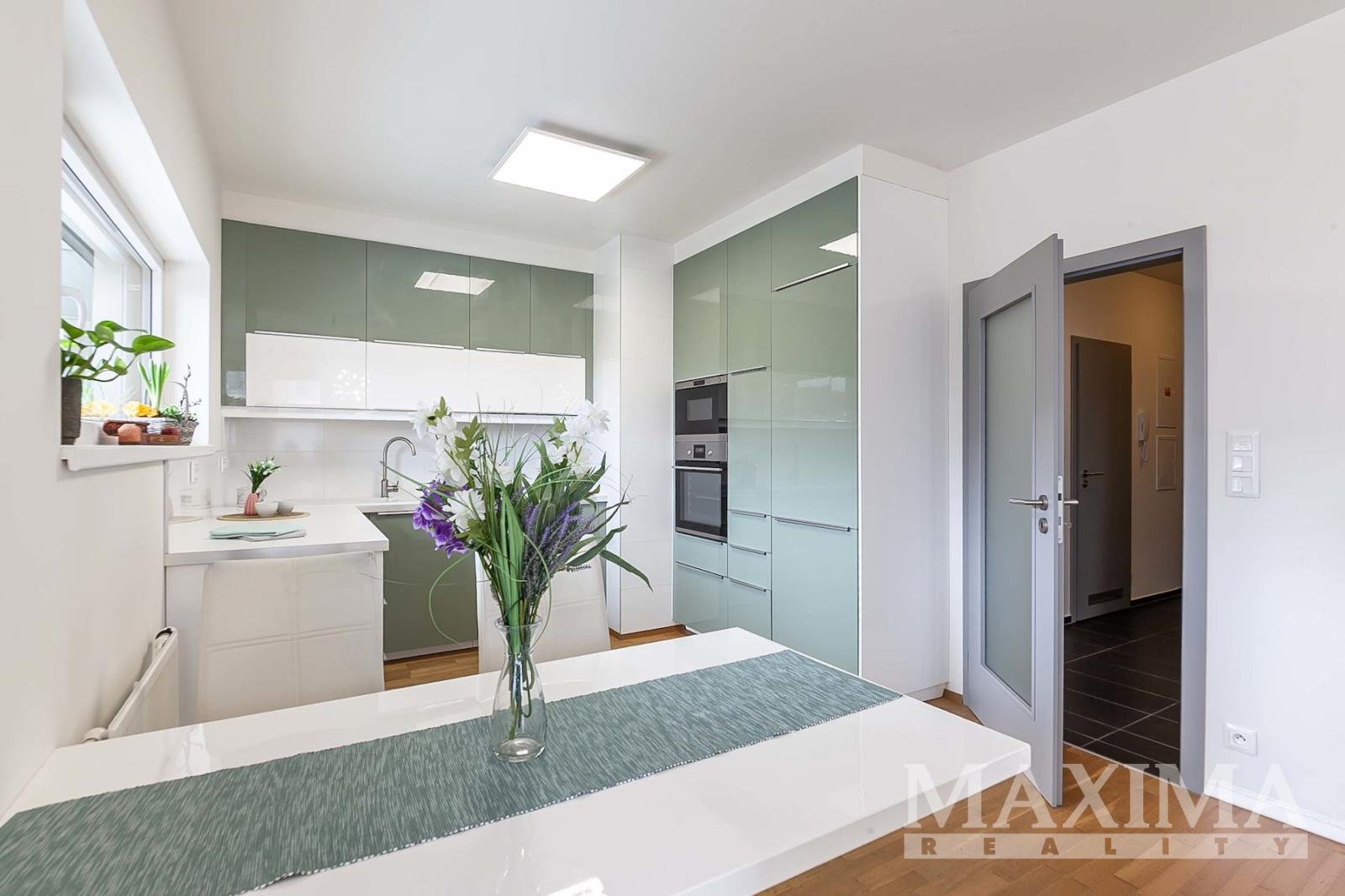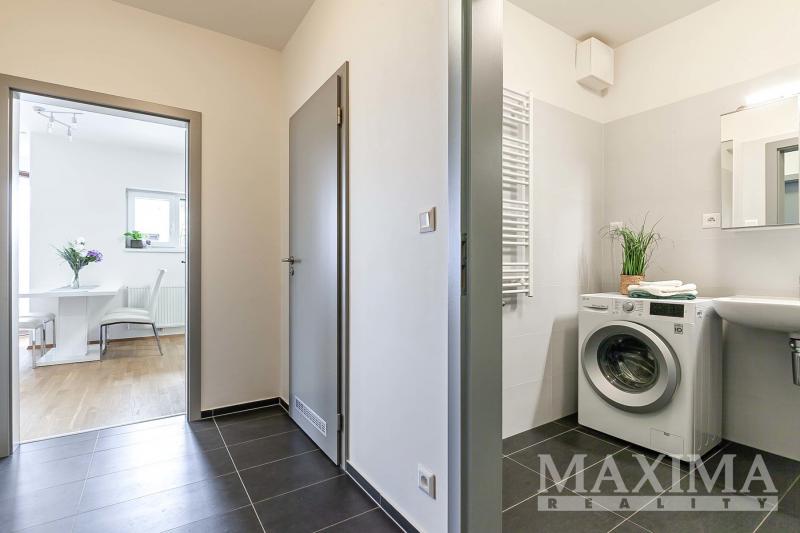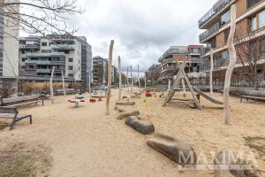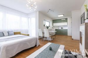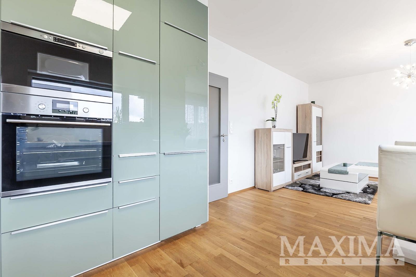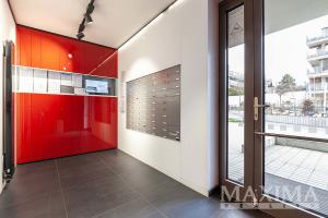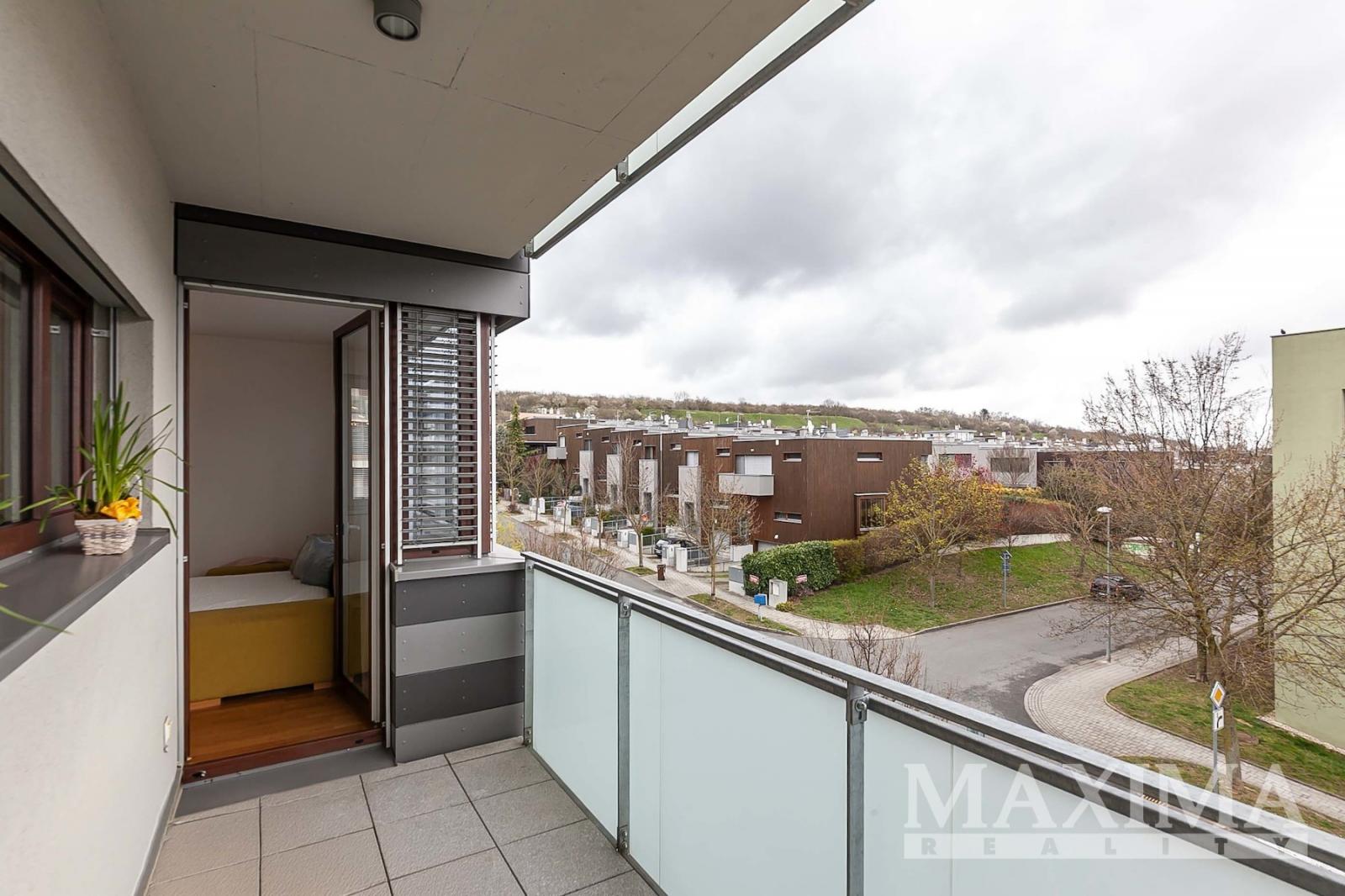 Dominantou bytu je světlý obývací pokoj o velikosti 27,6 m2, který je propojen s kuchyňským a jídelním koutem a nabízí přímý vstup na JV orientovaný balkon s příjemným výhledem do moderního okolí. Elegantní kuchyňská linka na míru je vybavena kvalitními vestavěnými spotřebiči. Dále je k dispozici ložnice o velikosti 14,1 m2, koupelna o velikosti 4 m2 s vanou se sprchovací zástěnou a prostorem pro pračku i sušičku, samostatná toaleta a vstupní předsíň.