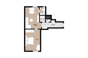 Místnosti: Obývací pokoj s kuchyňským koutem 23m2, samostatný pokoj 22m2, předsíň 10m2, koupelna 2,4m2, 1,3m2.