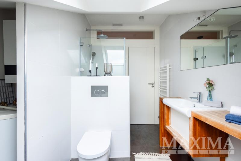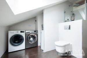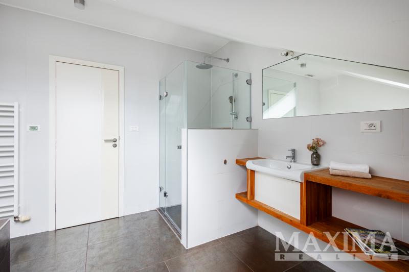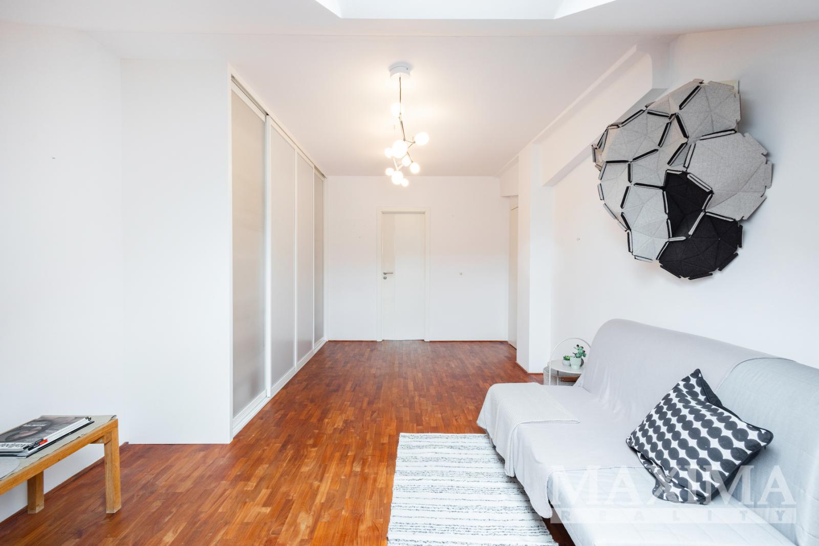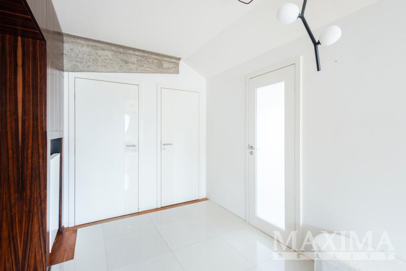 Velmi působivý je světlý a vzdušný obývací pokoj spojený s kuchyňským koutem a jídelnou, výměra tohoto prostoru je velkorysých 63 m2, dominantou je zde pětimetrový kuchyňský pult z pohledového betonu. Obývací pokoj je od vstupní chodby oddělen prosklenými posuvnými dveřmi, z chodby se dále vchází do dětského pokoje a manželské ložnice. Byt disponuje dále dvěma koupelnami, samostatným WC a šatnou. Součástí bytu je i velký úložný prostor na půdě.