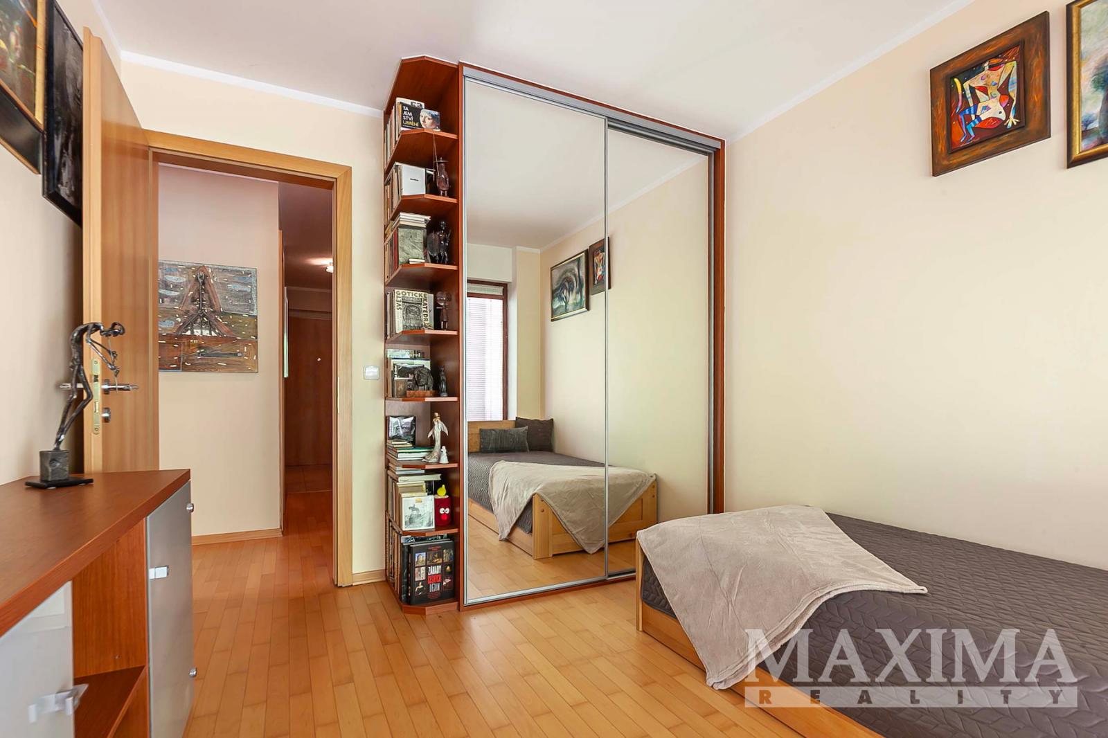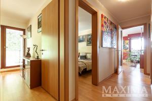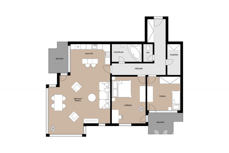 Dispozice bytu zahrnuje dominantní obývací pokoj s kuchyňským koutem a jídelní částí o výměře 42,2 m2 s přímým vstupem na lodžii. Prostor je obohacen velkorysým arkýřem, který zajišťuje dostatek denního světla a příjemnou atmosféru pro každodenní život. Hlavní ložnice má výměru 15,2 m2 a další pokoj o velikosti 11,4 m2 s vlastní lodžií a vestavěnou skříní je vhodný jako dětský pokoj či pracovna. Dále je k dispozici koupelna s vanou a WC, praktická komora (šatna) a prostorná vstupní chodba.