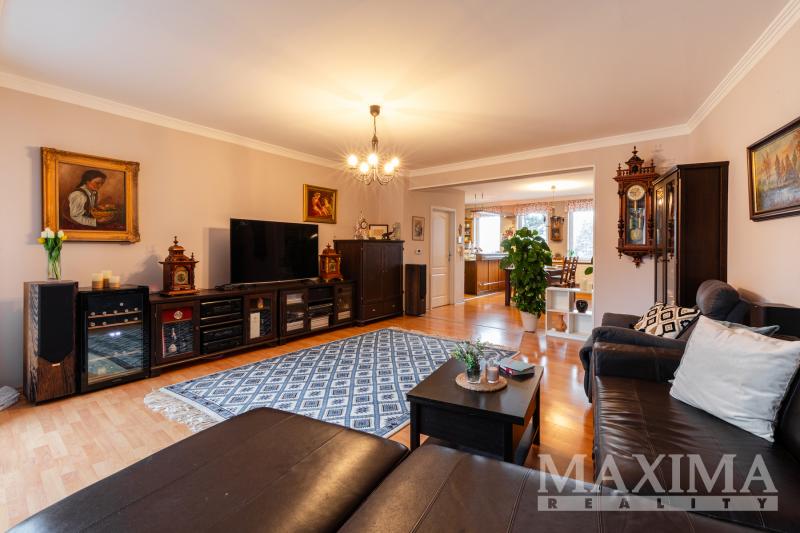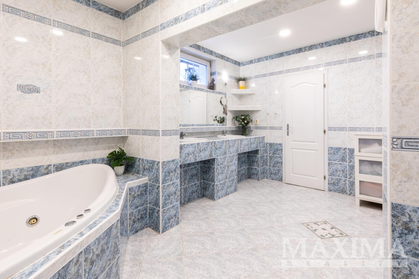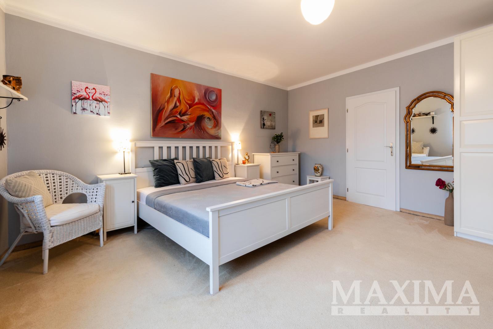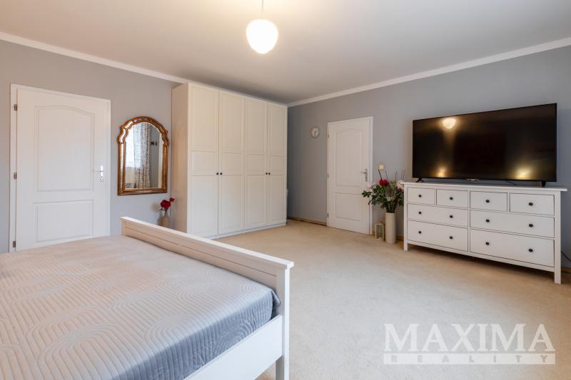 V 1. patře se nachází prostorný byt 5+kk o rozloze 247 m2, kolaudovaný v roce 2000. Dispozice nabízí hlavní ložnici s velkou šatnou, dva pokoje, pracovnu, dvě koupelny _ hlavní s vířivou vanou, bidetem a dvěma umyvadly a samostatné WC, ve druhé koupelně je toaleta, sprchový kout a umyvadlo. Technická místnost je vybavena plynovým kotlem, pračkou a sušičkou, s dostatkem úložného prostoru. Obytné pokoje a obývací část jsou orientované do klidné jižní zahrady.