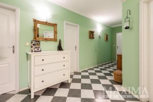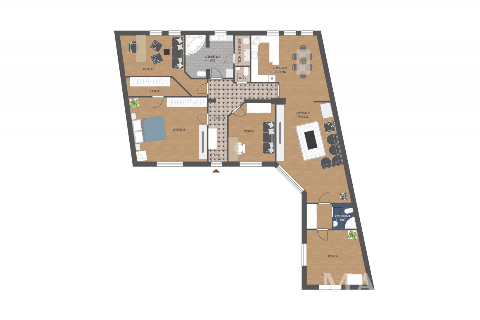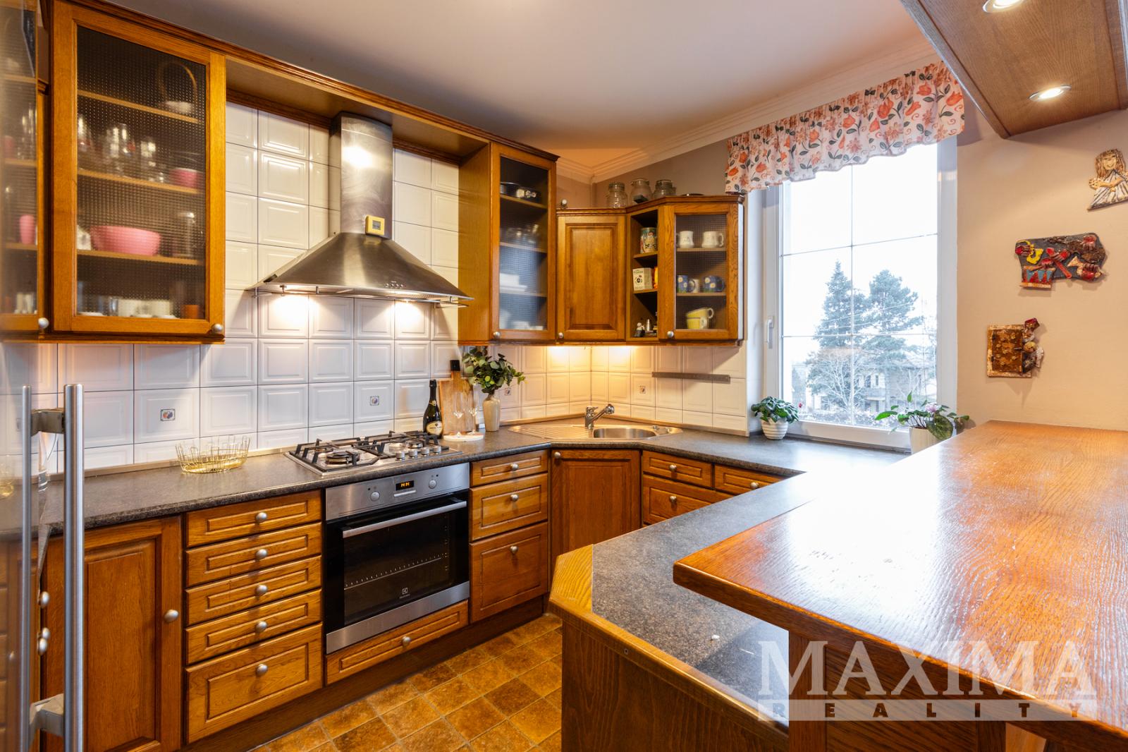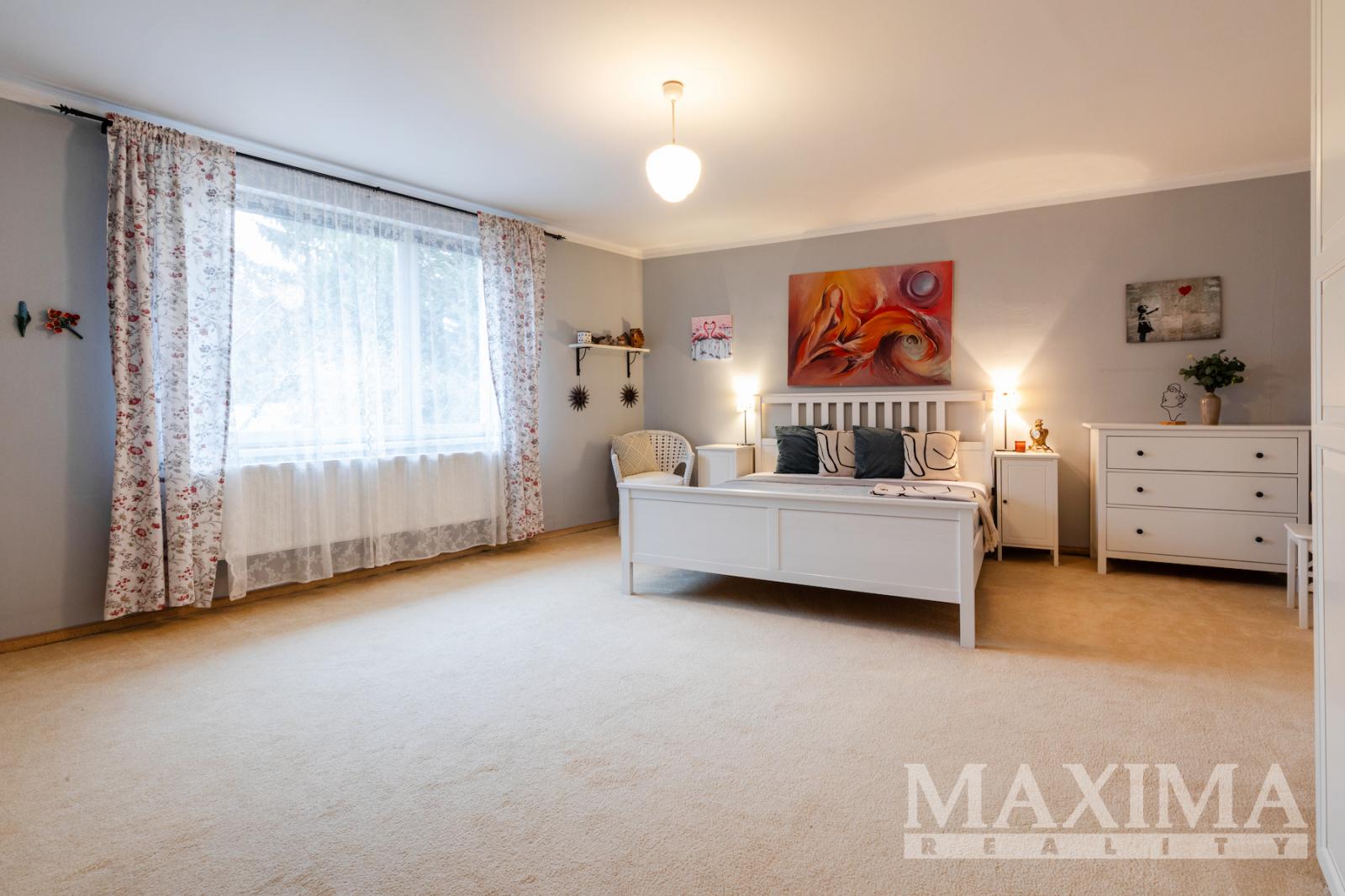 V 1. patře se nachází prostorný byt 5+kk o rozloze 247 m2, kolaudovaný v roce 2000. Dispozice nabízí hlavní ložnici s velkou šatnou, dva pokoje, pracovnu, dvě koupelny _ hlavní s vířivou vanou, bidetem a dvěma umyvadly a samostatné WC, ve druhé koupelně je toaleta, sprchový kout a umyvadlo. Technická místnost je vybavena plynovým kotlem, pračkou a sušičkou, s dostatkem úložného prostoru. Obytné pokoje a obývací část jsou orientované do klidné jižní zahrady.