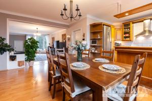 V přízemí domu je plně vybavená a provozovaná restaurace o rozloze 177 m2, aktuálně pronajatá na dobu neurčitou s pravidelně hrazeným nájemným, generující stabilní pasivní příjem. Součástí jsou také prostorné garáže (85 m2) s elektrickými vraty a dvě dílny. Objekt je zabezpečen kamerovým systémem s napojením na PCO a dálkovým vstupem přes mobilní telefon.