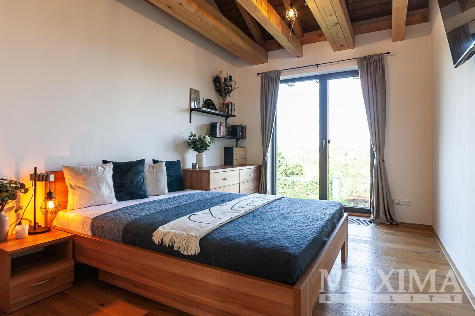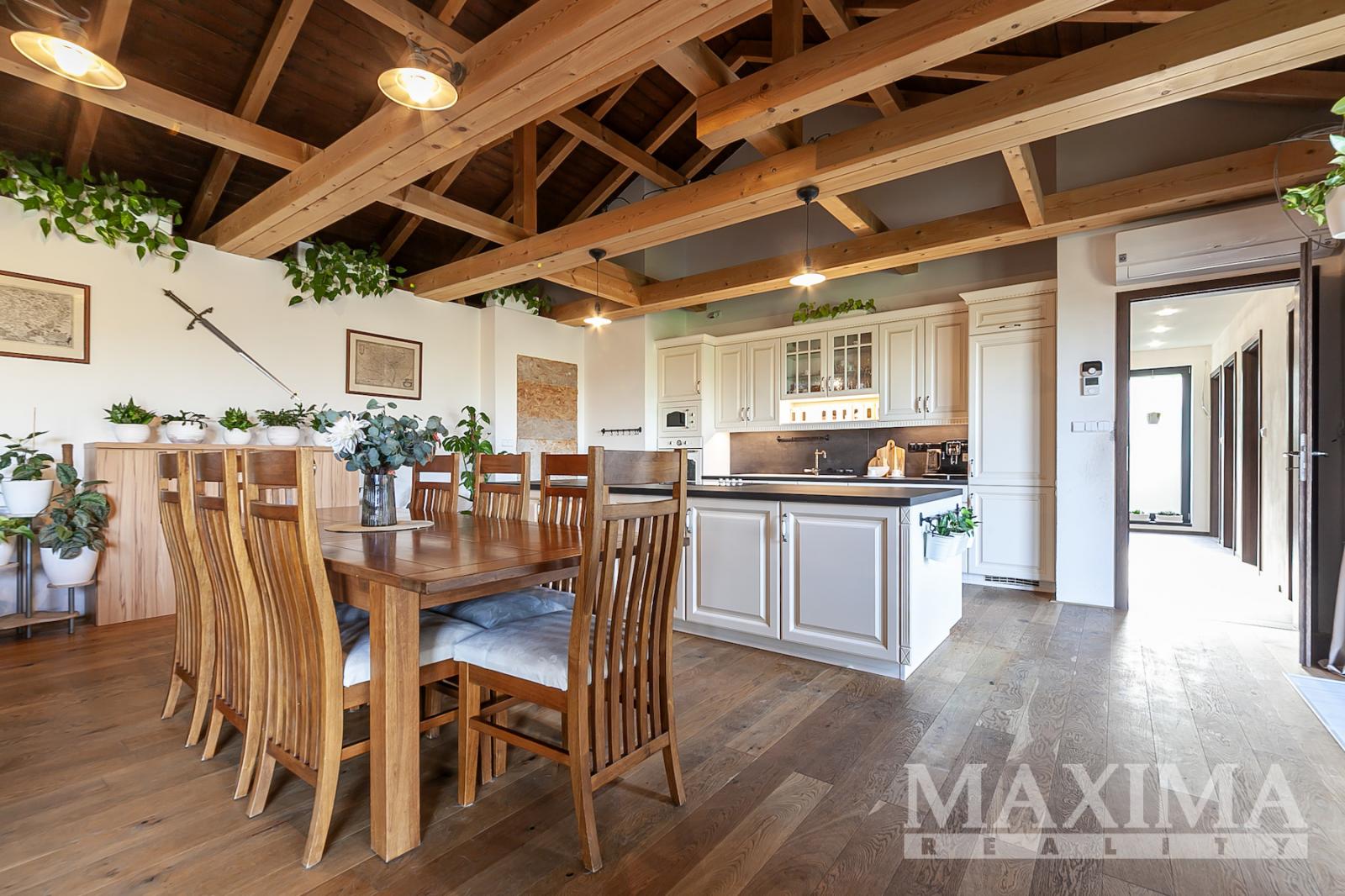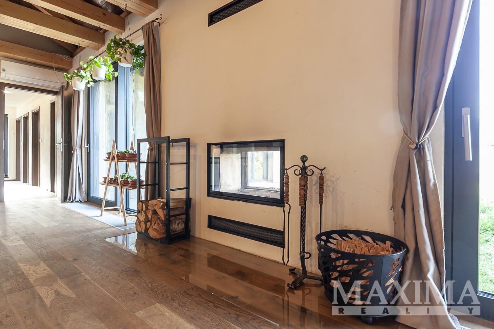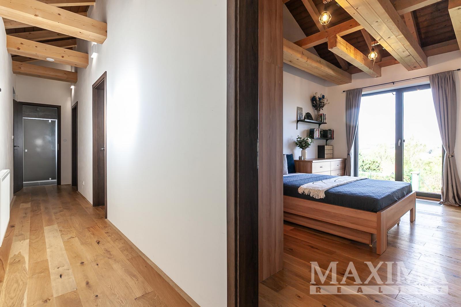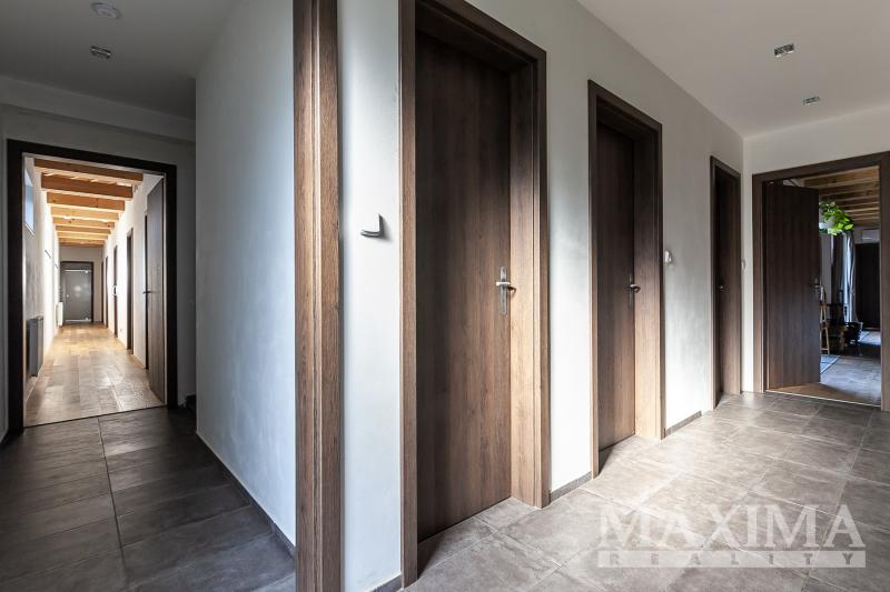 Prostorný dům z roku 2021 se 7 pokoji, 3 koupelnami, wellness centrem ve stavu hrubé stavby a prostorem pro parkování až 5 aut je postavený tak, že je možné jej použít jako domov pro velkou rodinu nebo pro potřeby malé firmy, pro ubytování či jako vícegenerační bydlení. Dům je situován do tvaru L, má dva samostatné vchody a možnost rozdělení na dvě samostatné části. Kromě nadstandardní plochy a počtu pokojů dávají vysoké stropy s dřevěnými trámy prostorám domu vzdušnost i do výšky. V centrální částí domu tvoří dominantu obrovský obývací pokoj s kuchyňským koutem, krbem použitelným z vnitřní i vnější strany domu a spojením s nedokončenou suterénní místností zamýšlenou jako wellness centrum.