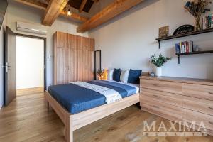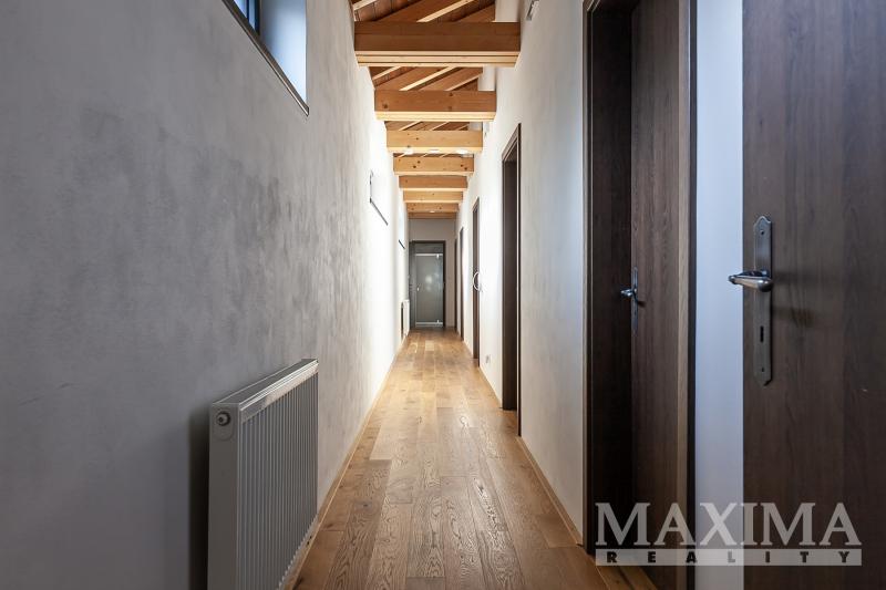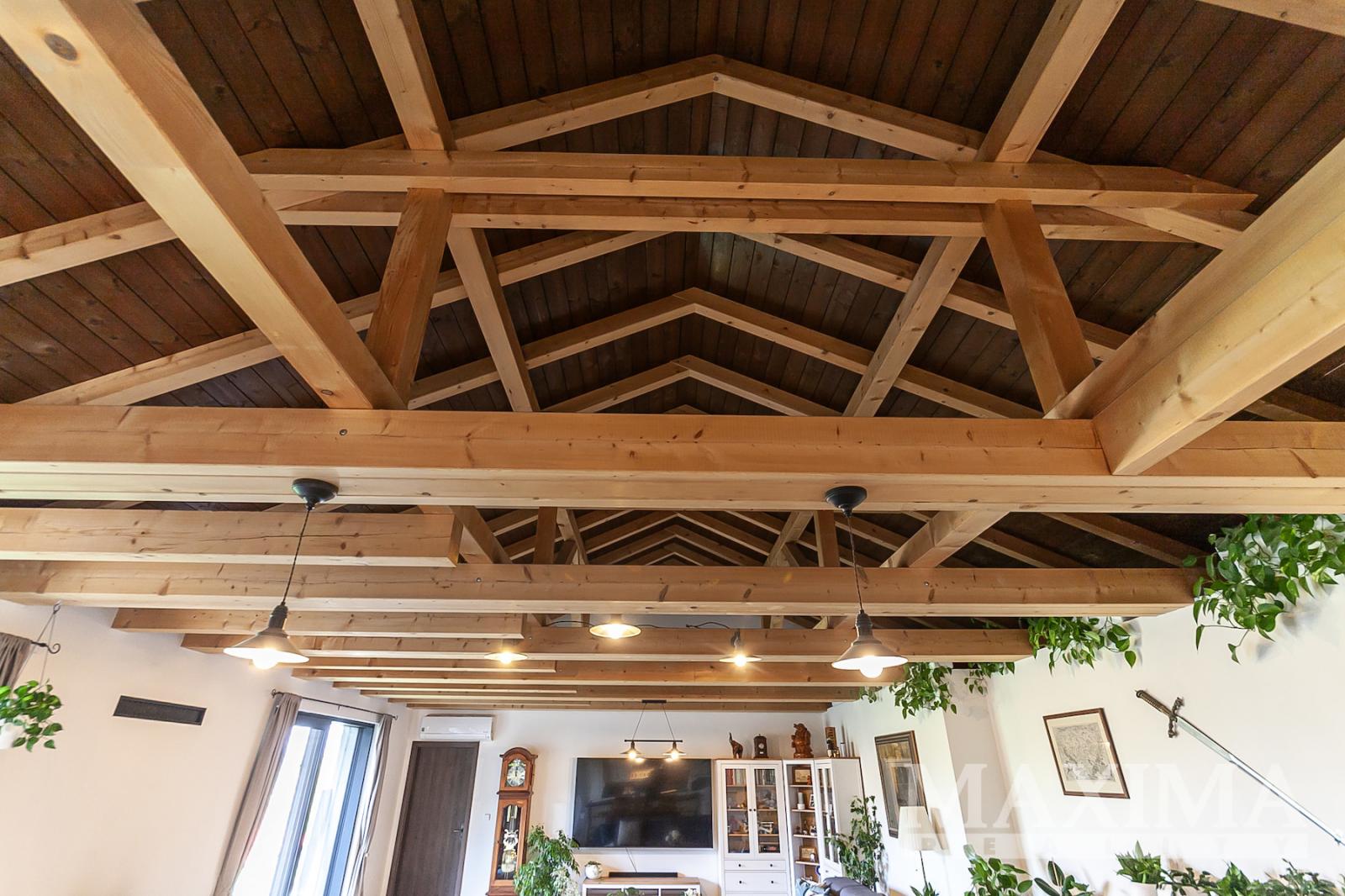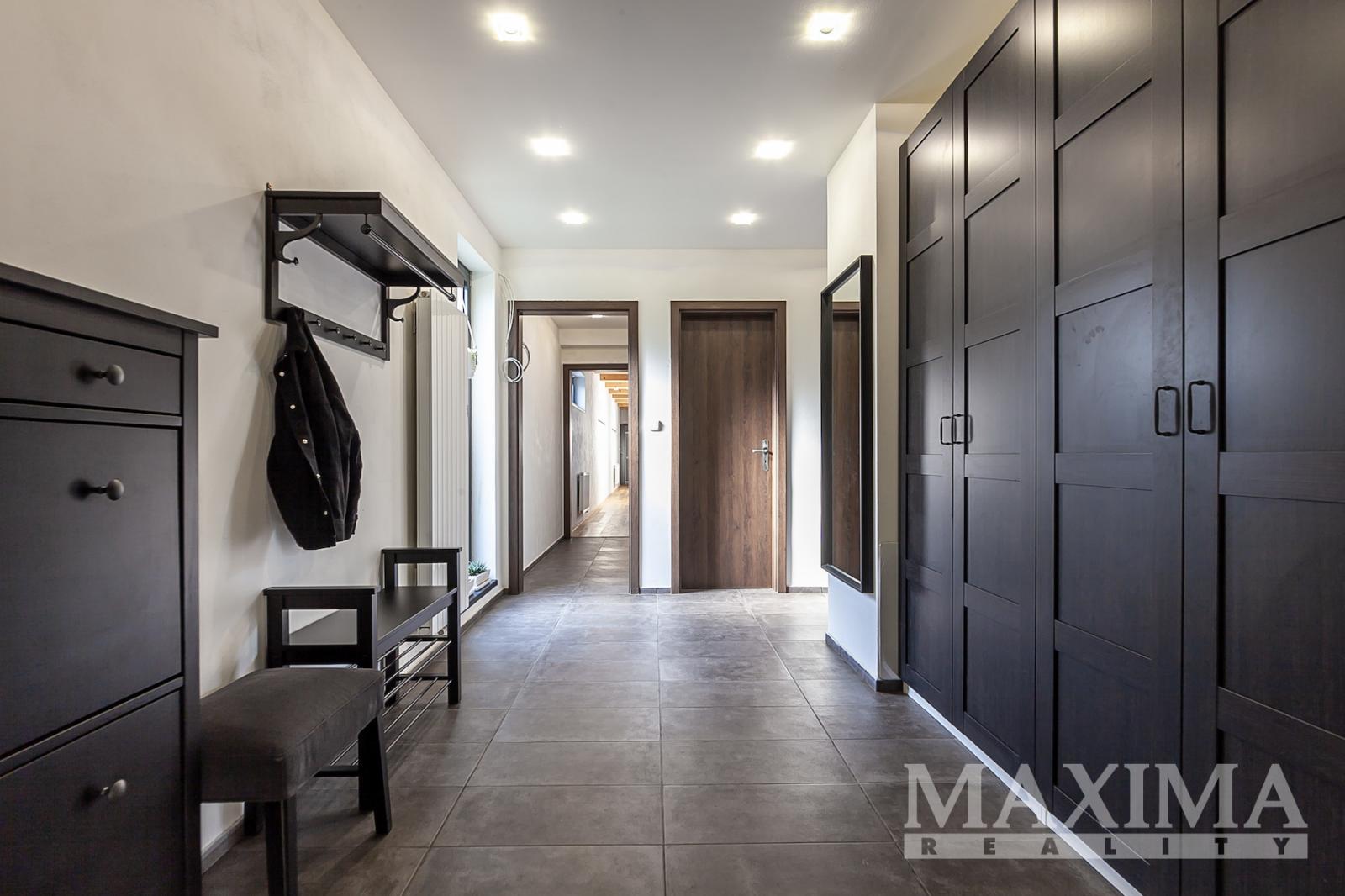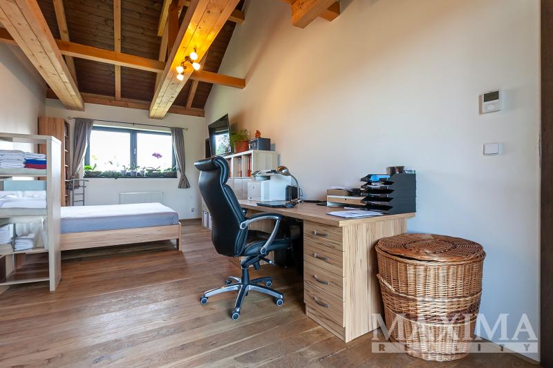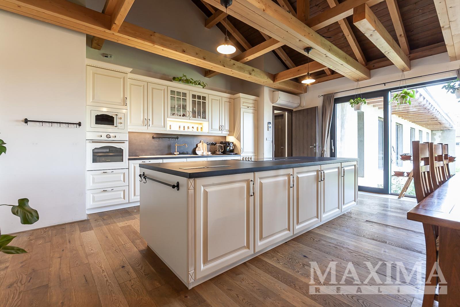 Prostorný dům z roku 2021 se 7 pokoji, 3 koupelnami, wellness centrem ve stavu hrubé stavby a prostorem pro parkování až 5 aut je postavený tak, že je možné jej použít jako domov pro velkou rodinu nebo pro potřeby malé firmy, pro ubytování či jako vícegenerační bydlení. Dům je situován do tvaru L, má dva samostatné vchody a možnost rozdělení na dvě samostatné části. Kromě nadstandardní plochy a počtu pokojů dávají vysoké stropy s dřevěnými trámy prostorám domu vzdušnost i do výšky. V centrální částí domu tvoří dominantu obrovský obývací pokoj s kuchyňským koutem, krbem použitelným z vnitřní i vnější strany domu a spojením s nedokončenou suterénní místností zamýšlenou jako wellness centrum.