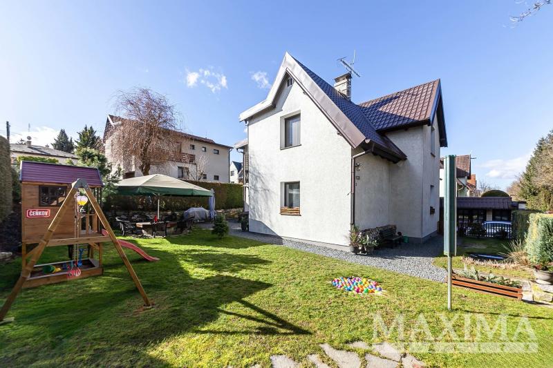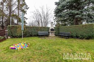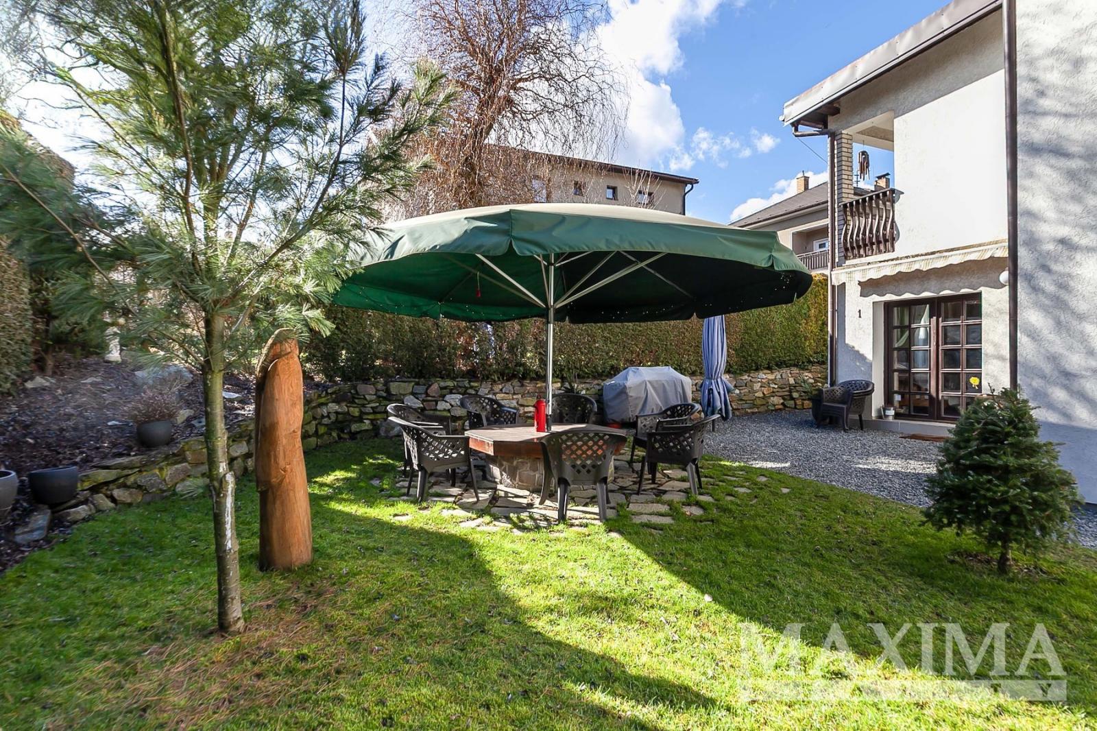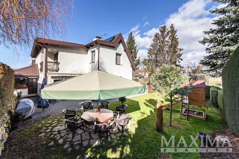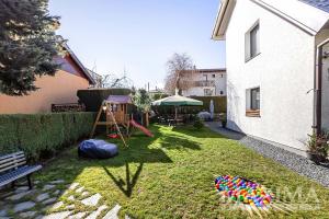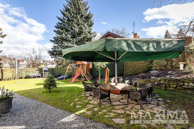 Z obývací části domu je přímý vstup na upravenou zahradu (486 m2) s markýzou, jezírkem, venkovním krbem s udírnou, posezením a soukromým dětským hřištěm. Tato zahrada nabízí ideální prostor pro odpočinek, grilování a setkání s rodinou a přáteli.