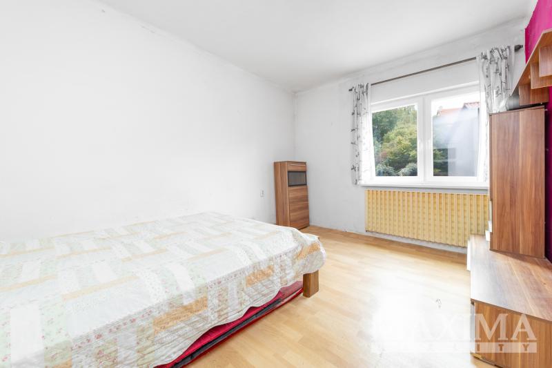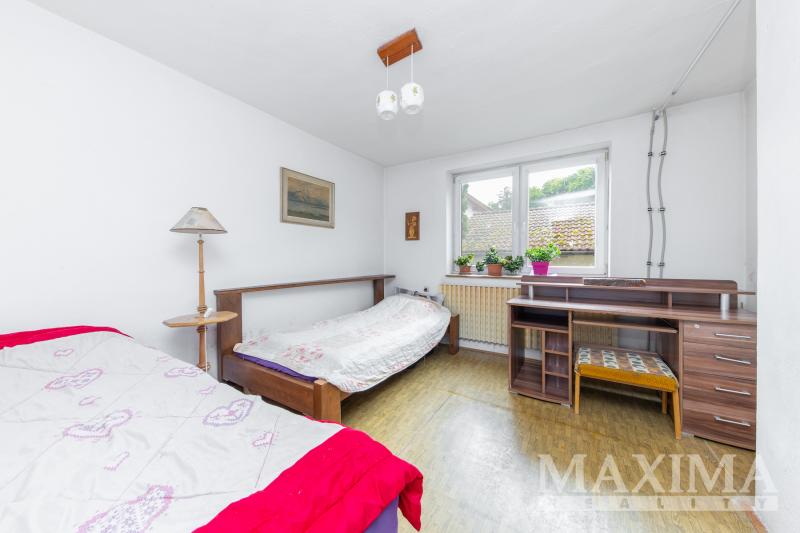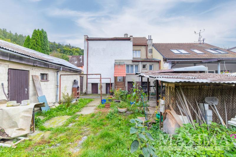 Podél domu je příjezd ke garáži uprostřed pozemku. Při investičním záměru s vybudováním bytových jednotek se nabízí garáž zbourat a zajistit volný průjezd k parkování za domem.