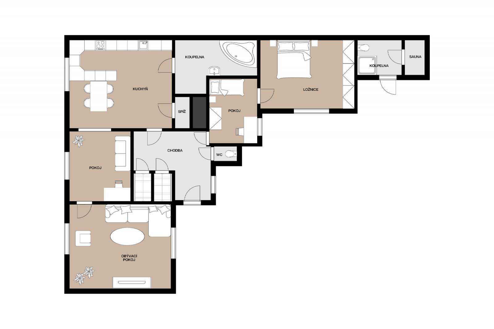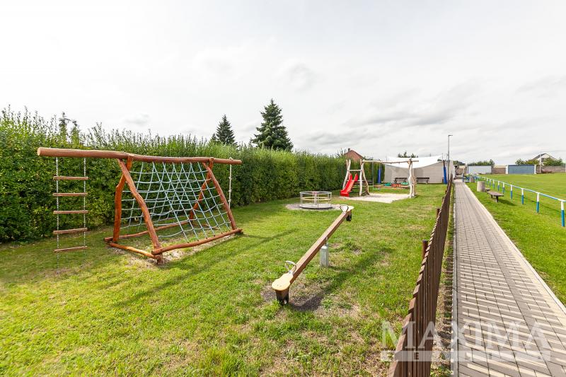 V přízemí o dispozici 4+1 se nachází obývací pokoj s kuchyňským koutem orientovaným na západ, tři prostorné samostatné pokoje, koupelna, samostatná toaleta a spíž. Podkroví nabízí dva zateplené pokoje, sklep má velikost 9,8 m2 a ze dvora je přístupná wellness část se saunou a sprchou.