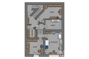 Suterén domu je vybaven technickým zázemím a samostatným prostorem, který může v budoucnu sloužit například jako tělocvična, posilovna, herna nebo kino.